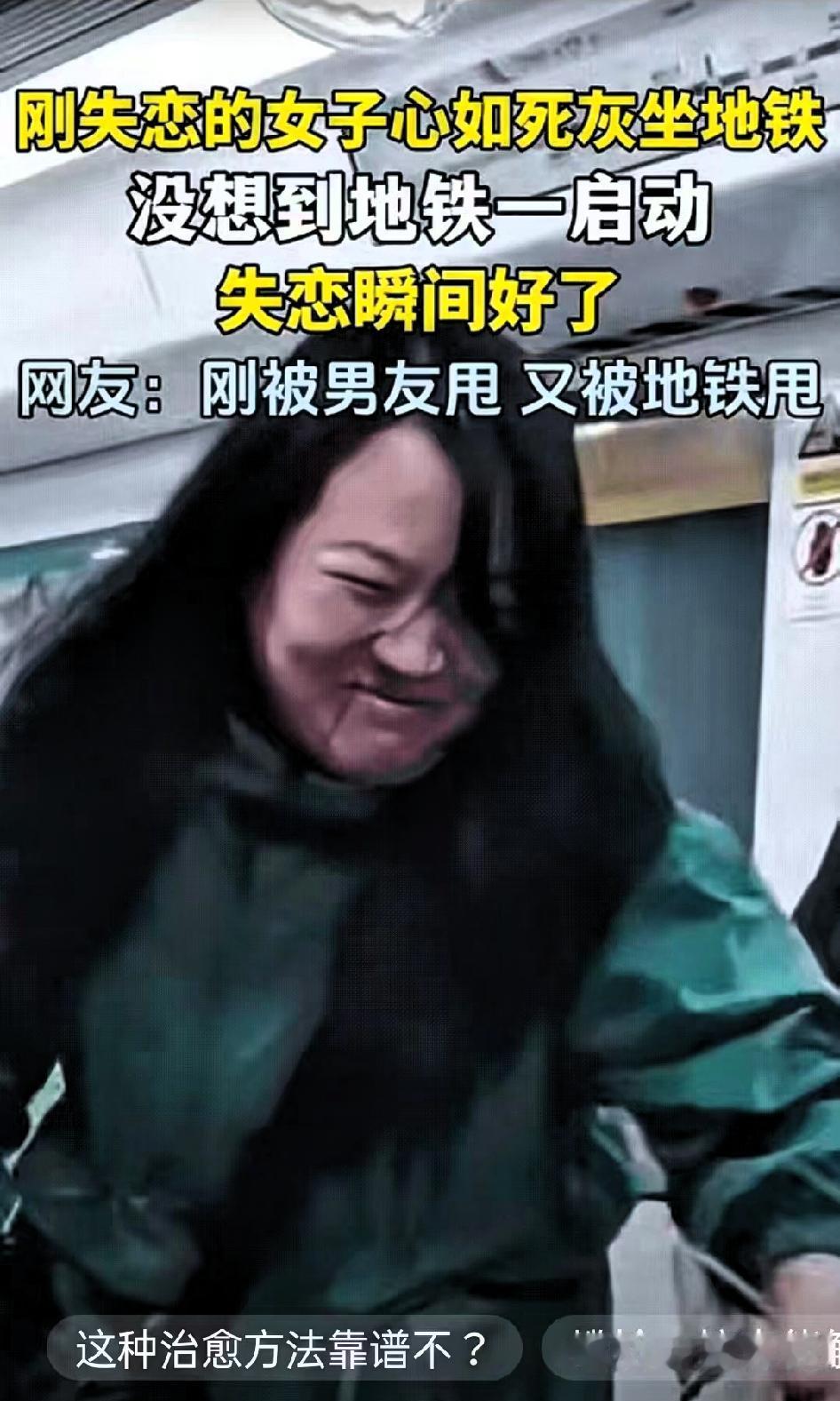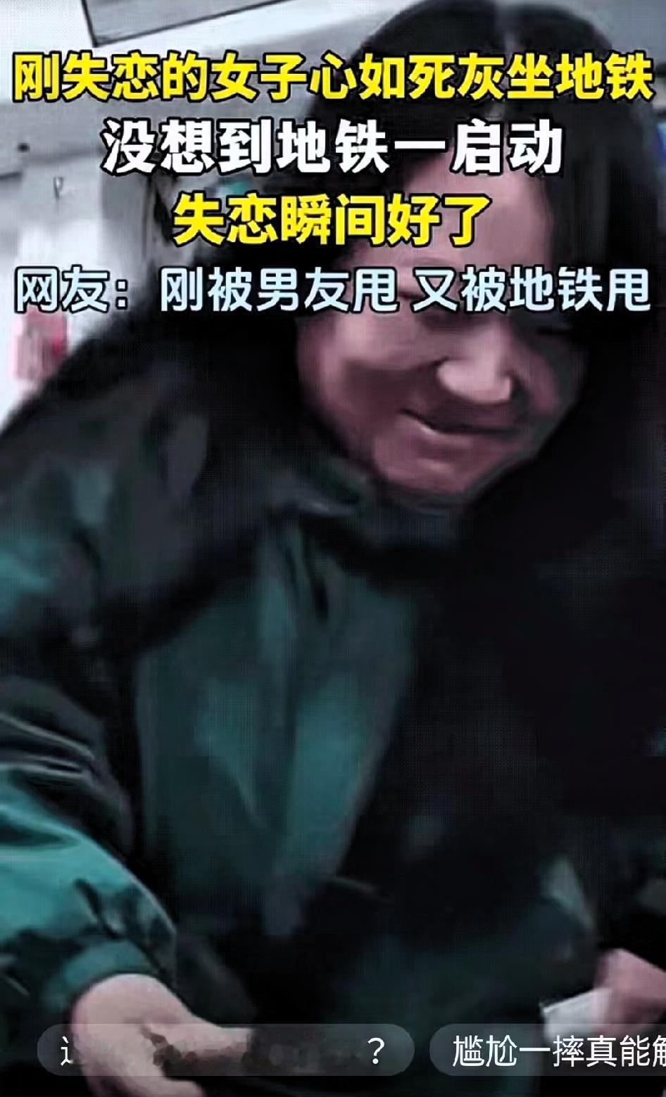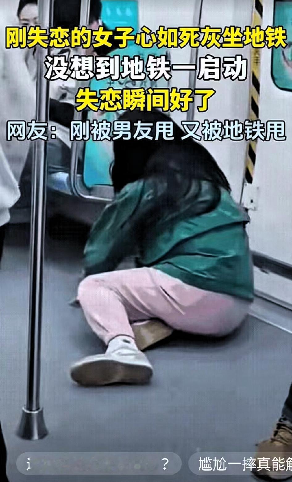 笑不活了!”江苏一名女子刚失恋,和男朋友分手后她搭乘地铁回家,整个人像霜打蔫的菜,脸色发白,肩膀垮得快贴到胸口。 朋友看着心疼,劝她找个座位歇会儿,她也只是木愣愣地摇头,那股子“天塌了”的劲儿,任谁看了都想递张纸巾。 可谁能料到,地铁刚启动,她没稳住重心,“哐当”一声摔在地上,手忙脚乱爬起来时,看着自己沾了灰的裤腿,突然“噗嗤”笑出了声,刚才还僵着的脸,一下子就有了血色,眼里的死气也散了大半。 网友都乐了,说她“刚被对象甩,又被地铁甩,惨得有点可爱”,还有人调侃“这地铁比心理咨询还管用,失恋的都来试试”。其实细琢磨,这哪是倒霉啊? 人难过的时候,总爱把自己困在情绪里钻牛角尖,觉得失恋就是天大的事。可偏偏这种猝不及防的小尴尬、小狼狈,能一下子戳破那层紧绷的emo,让人突然醒过神:原来日子里还有这么好笑的插曲,也没那么难熬。 咱老百姓过日子都懂,谁没遇过沟沟坎坎?有时候硬扛着反而越憋越难受,倒是偶尔的小乌龙、小糗事,能帮咱松口气。你有没有过这种时候?本来满心委屈快哭了,结果被一件傻事逗得破涕为笑,瞬间觉得心里的石头轻了不少?