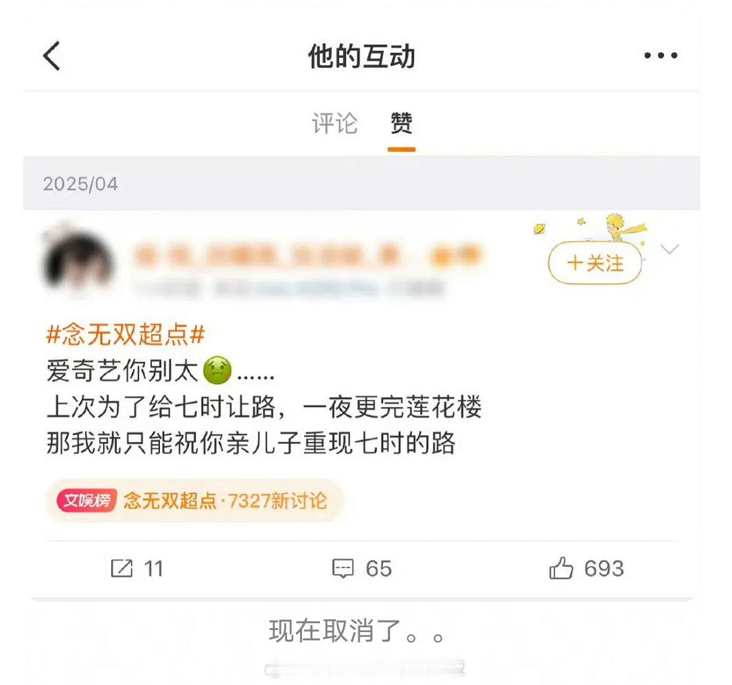 当时唐嫣粉丝吐槽爱奇艺排播不当,让念无双给淮水竹亭让路,然后王家卫点赞了这条微博。