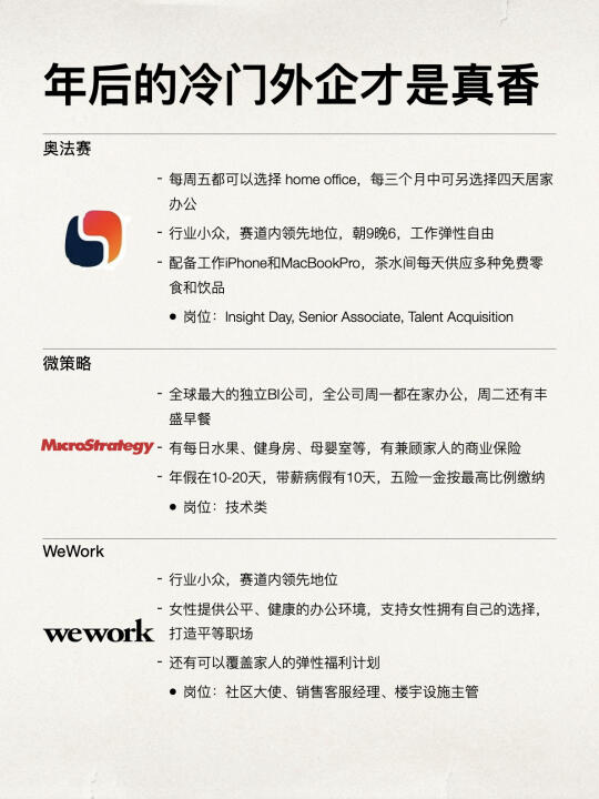 其实真正好的外企都是不宣传的!年后找工作就往这些方向冲 . 🔻比如说最近发现的一些小众外企,发现这些冷门一点的外企双休不加班,955,更有超过10天的年假,而且很多都是灵活办公,也有HR、行政这些岗位,实现WLB,比想象中的更香🌷 . 🔎p1-p2就给大家整理了几家,岗位、福利都写了 🔎p3 最近还花时间整理了一些外企内部资料,包括有5000+外企信息、内部英文面试资料、100+页的外企名录,需要的直接来找我就行 . 每天更新优质工作资源,帮大家在找工作路上顺利拿offer! .