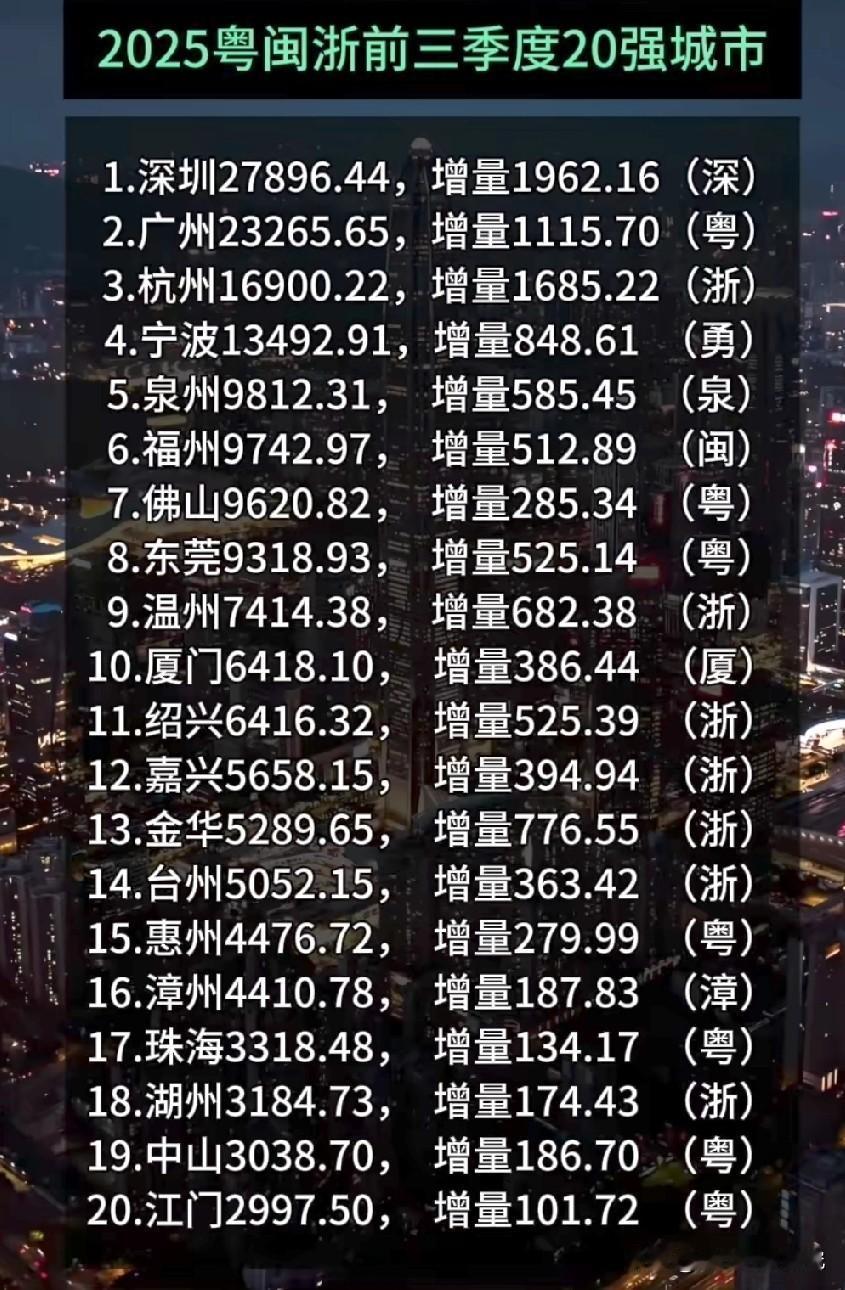 2025年前三季度粤闽浙(广东福建浙江)前二十强城市经济发展表现水平情况,粤闽浙