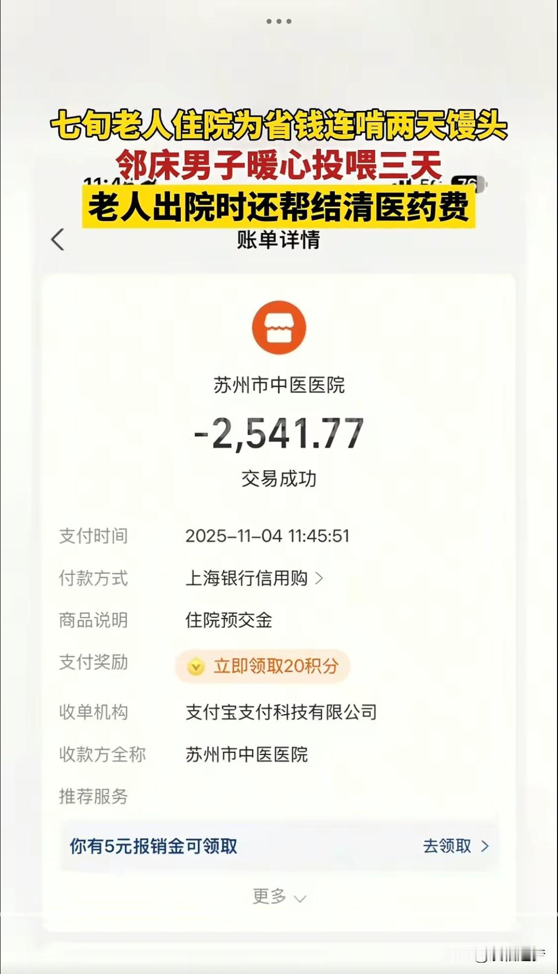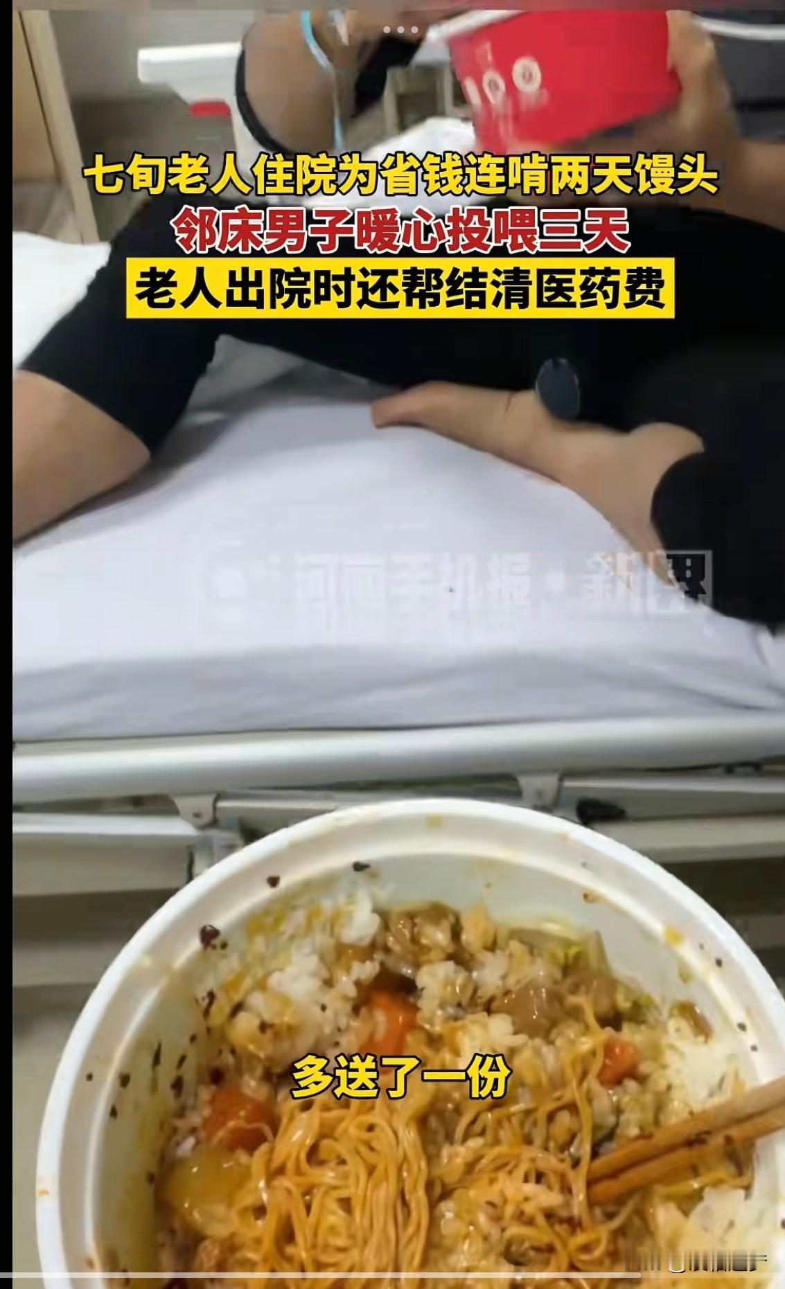 “这小伙太善良了。”一小伙因病住院时,忽然发现隔壁床七旬老人连啃两天馒头,他实在看不下去了,特意多叫了一份外卖,故意找借口点多了,连续投喂三天。本以为小伙只帮到这里就够了,结果老人出院时,小伙一个举动让全 网称赞。 老人住院5天,要不是小伙及时发现,估计要啃5天凉馒头了。 根据新界视频11月4日报道,这件暖心的事就发生在江苏苏州一家医院里。 小伙透露,住院当天遇到医生嘱咐隔壁床大爷不能只吃馒头要补充营养,可大爷只啃着凉馒头,还说:“家里没什么钱了,就吃两个馒头顶顶吧。”他心里一酸,马上点了两份外卖,还对大爷说,是自己点多了,邀请他一起吃。 可这位大爷似乎很要面子,推拒了好一会,才吃下了那一碗热乎饭。 此后3天里,大爷的一日三餐都被小伙“承包”了,直到大爷出院时,看着住院费突然愣住了,原来小伙竟然帮他把2000多块钱的住院费偷偷结清了,大爷无以为报,只能连声感谢。 小伙随手将视频发到了网上,希望有更多的人能够用举手之劳帮助老人,多做一些正能 量的事。 评论区一下子火了,纷纷给小伙点赞。 有网友说:遇到这样的老人,给他交住院费我可能做不到,我也穷,但是请他吃几天饭绝 对没问题! 也有网友分享自己的故事:我上次陪护也是遇到一个吃饭困难的,我都多打一份给她,说儿女都在外地顾不上她! 还有网友总结:这个世界总会在不经意间有温暖的阳光照耀,这个视频看了真的想替病中老人谢谢做好事不露脸的好心人,世界自有真情