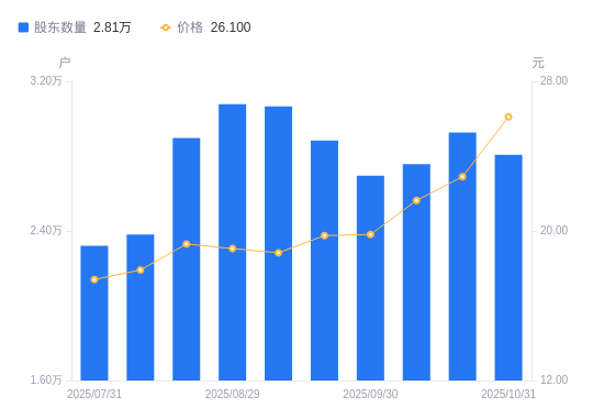 日期A股户数(户)流通A股户均持股数(股)户均持股市值(万元)2025-10-312807531921.8683.322025-10-202926630622.7870.132025-10-102757732498.3270.292025-09-302695933243.3165.852025-09-192884131074.0461.372025-09-103066629224.7555.032025-08-293077529121.2455.512025-08-202896930936.7459.712025-08-082381337635.1767.402025-07-312321338607.9567.18