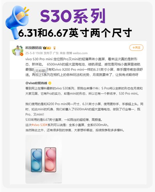最近刚准备在618期间换手机,发现vivo S30系列5月29日就要来了,让我太期待了! 这次vivo S30系列是撞色设计的轻薄果味小直屏,真的是新形态、新体验,表达了vivo S系列的态度,敢于做自己、敢于创新,非常符合年轻人的个性审美。 而且这次全系装载了6500mAh的超大蓝海电池,续航再也不用担心了。 对像我这样的喜欢小屏党的宝子们,可以冲vivo S30 Pro mini,6.31英寸小屏,单手握持和使用非常舒适。 心动的宝子们蹲起来了!