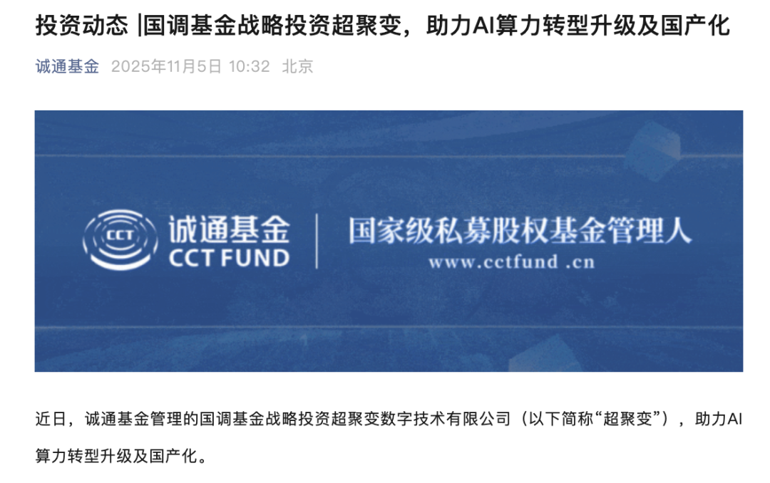 据诚通基金官微消息,其管理的国调基金于近日战略投资了超聚变。该基金是由中国诚通控股集团牵头设立的国家级基金,此前在半导体领域曾参与投资中芯国际、华芯鼎新等企业。