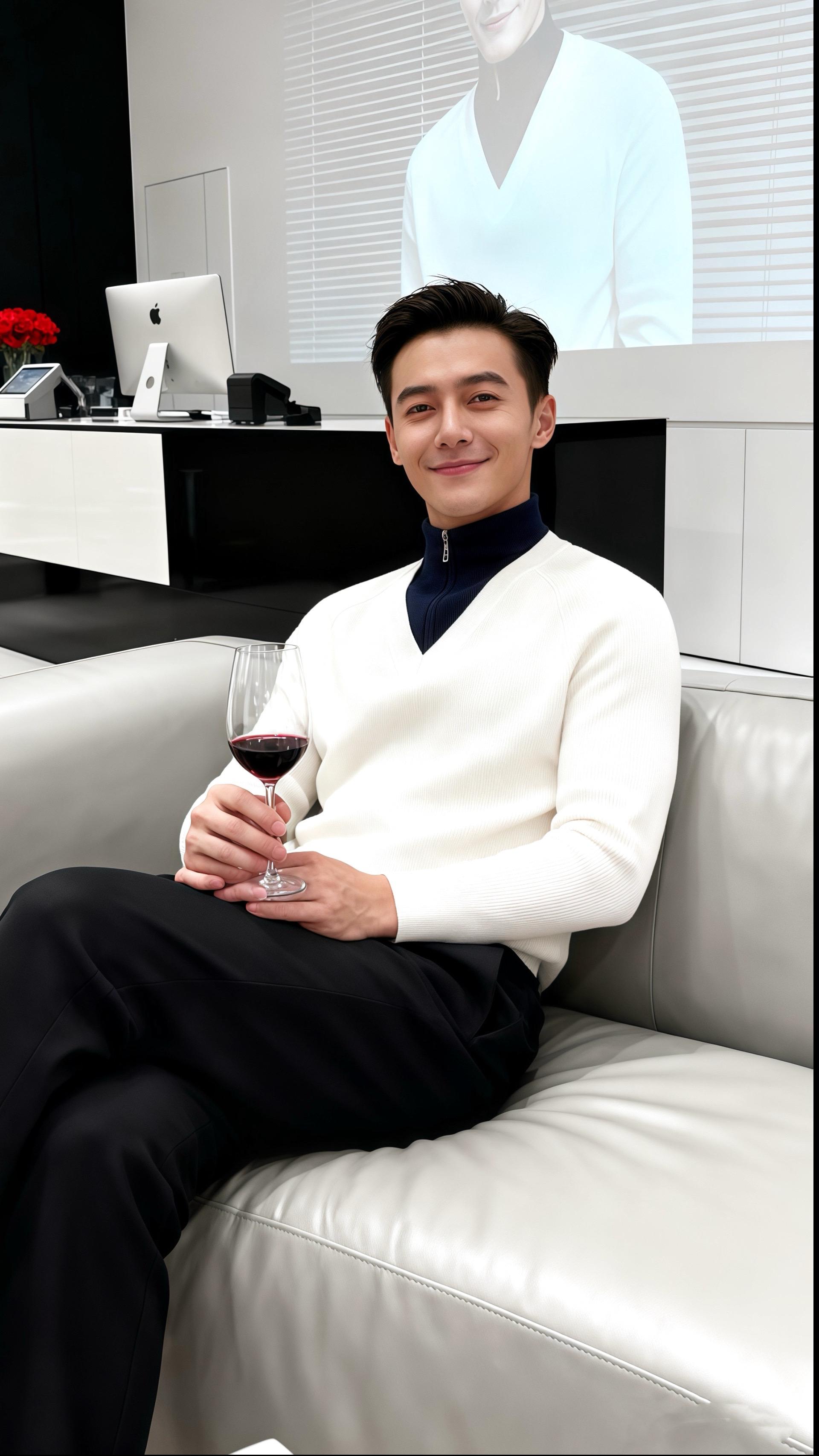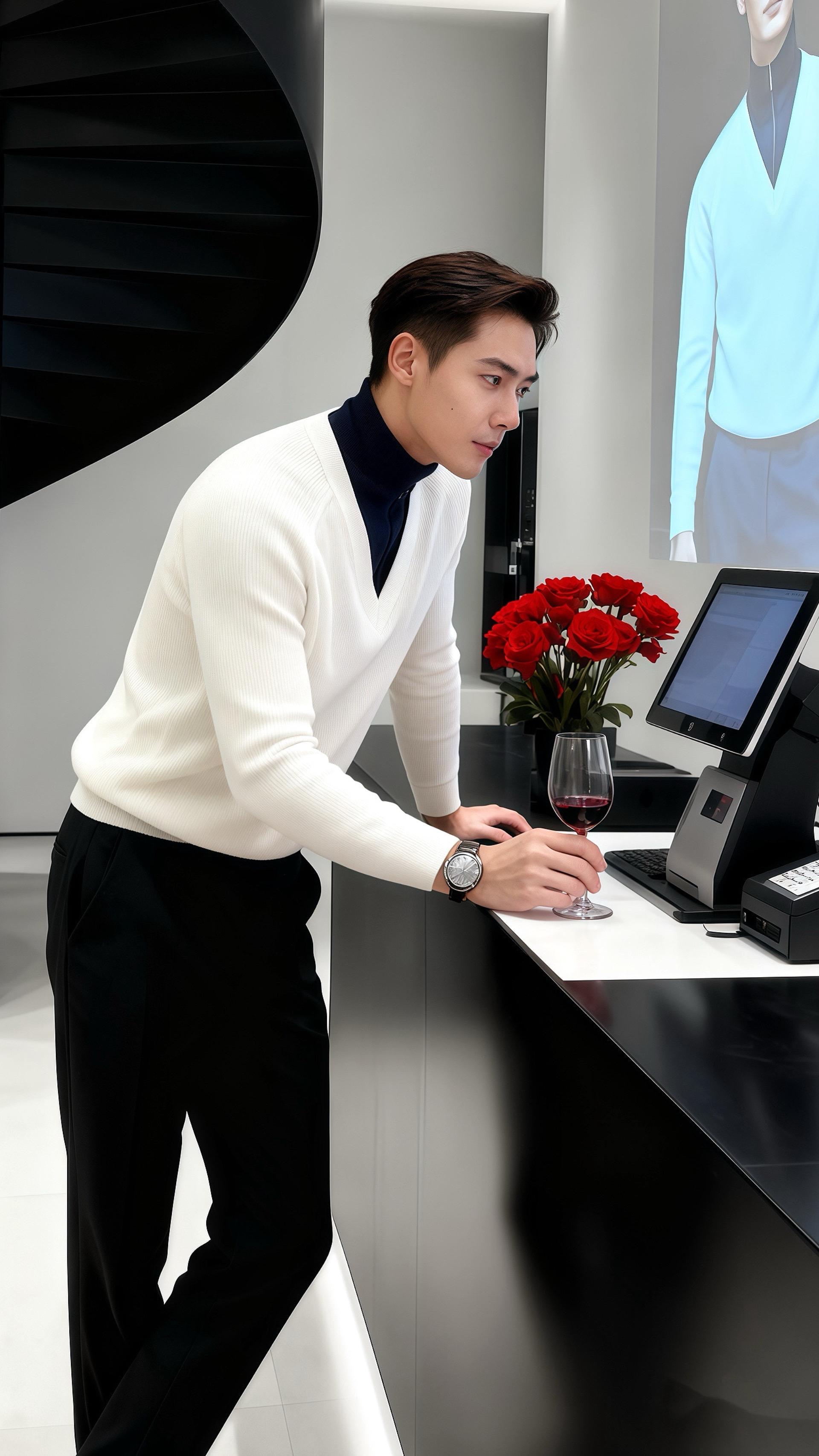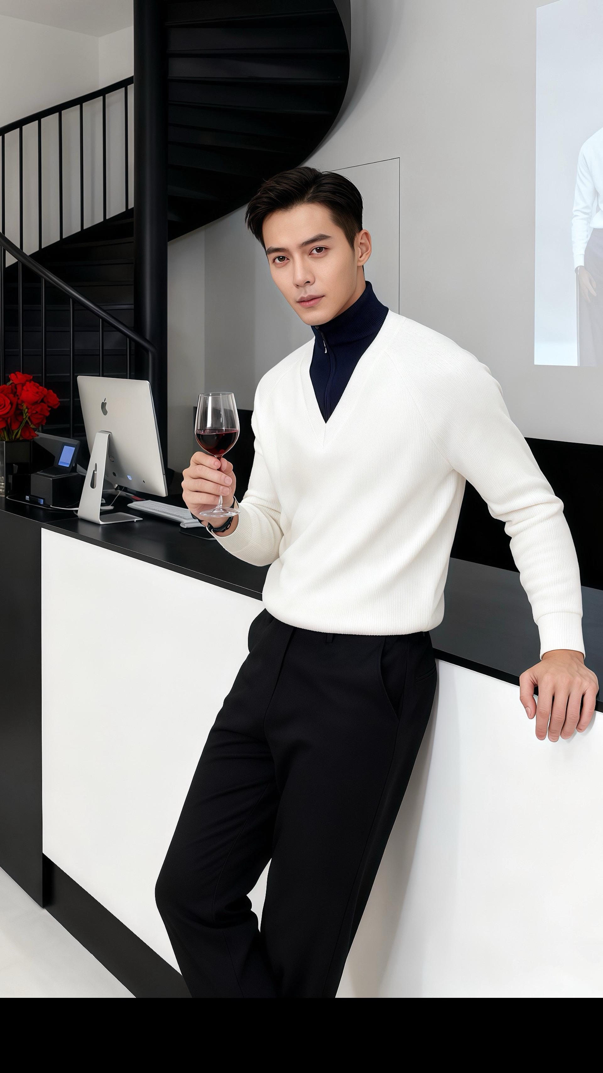 许妍推开门时,皓明正站在展厅的螺旋楼梯旁,指尖轻轻抚过人体模特的白色针织衫——那是和他身上一模一样的款式,藏青高领内搭衬得肩线干净利落。