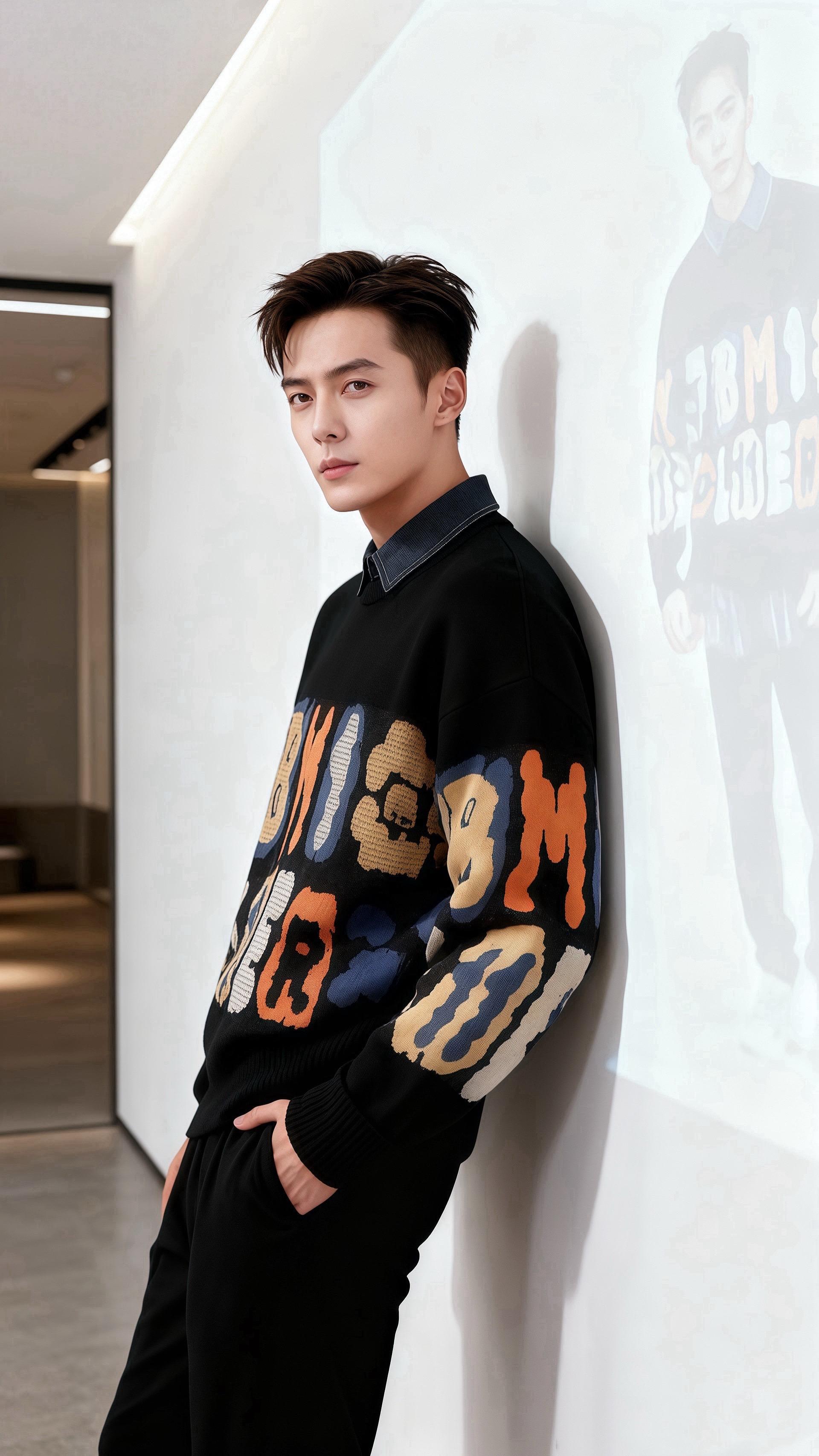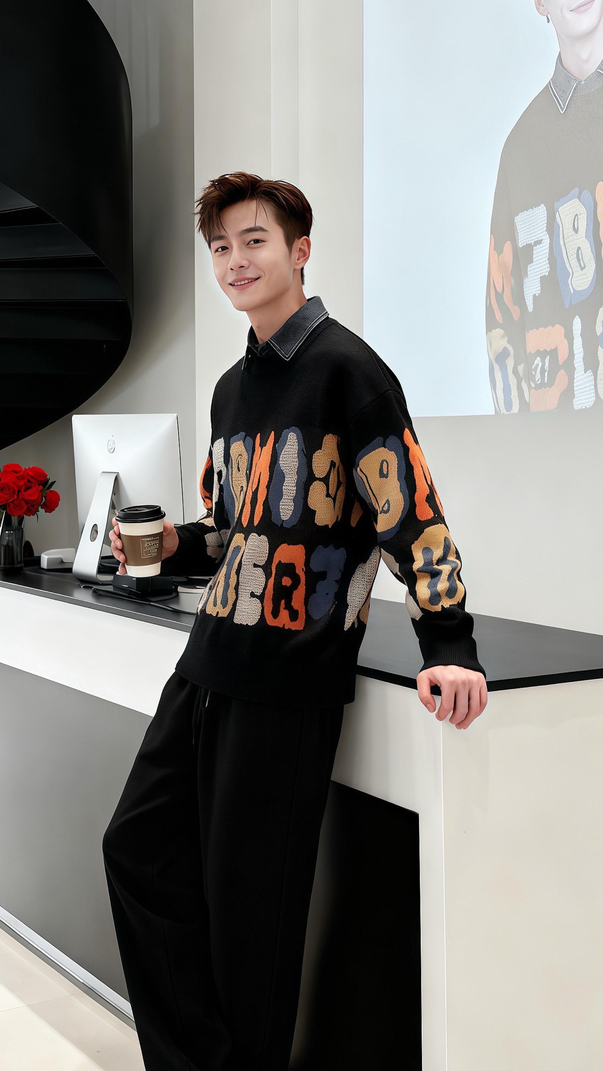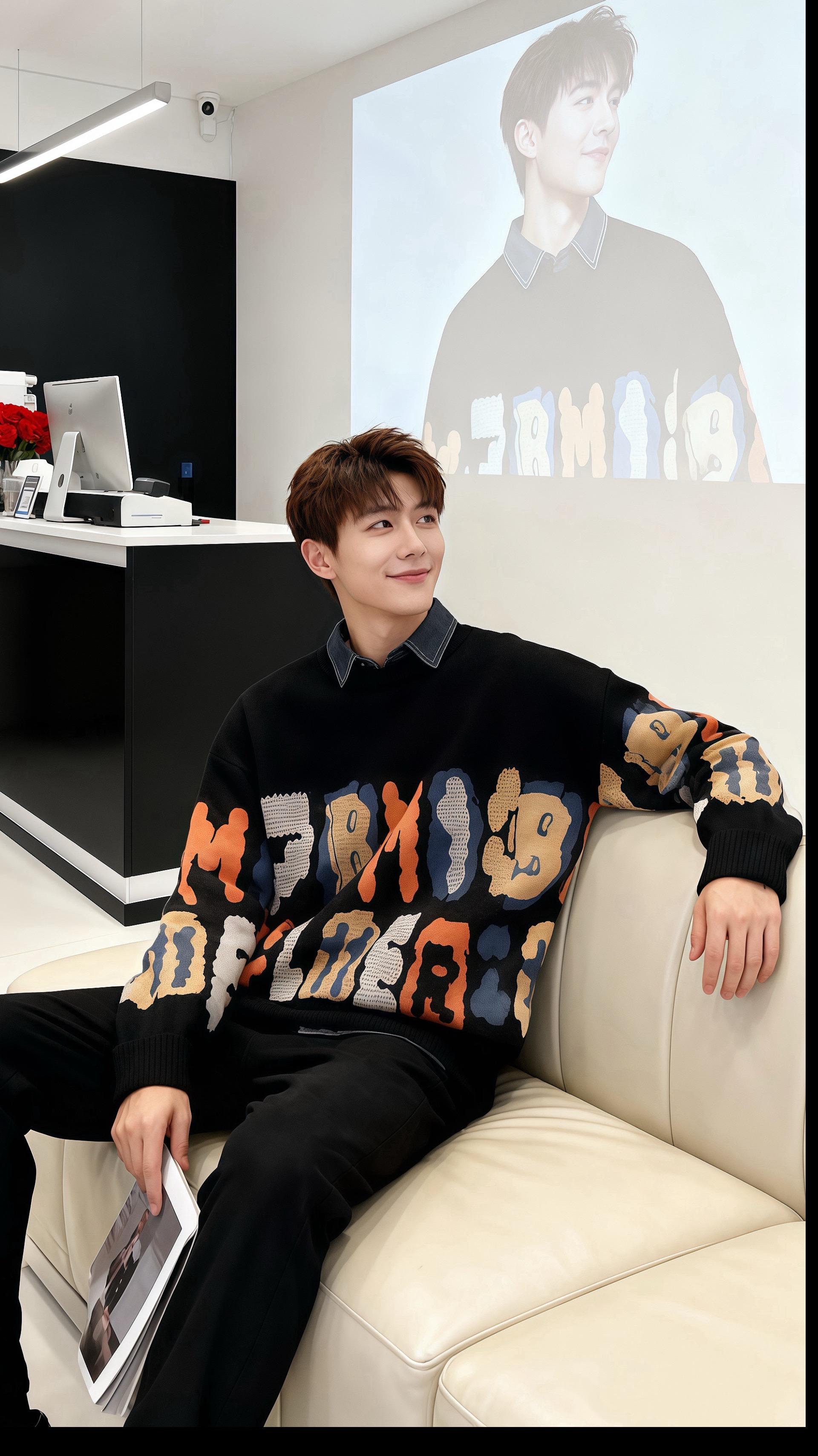 在一家设计感十足的艺术空间里,皓明穿着那件充满个性的黑色毛衣,站在黑白配色的柜台旁。他的侧背发型干净利落,脸上带着自信的微笑,仿佛在告诉自己:今天的努力,都是为了明天的绽放。