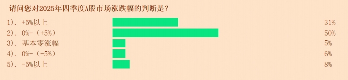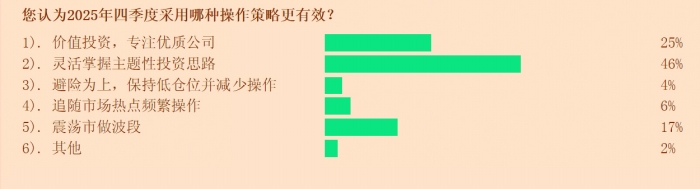 对于四季度市场将演绎何种行情风格:47%的投顾认为将呈现“结构性主升浪”,即部分板块表现突出;24%的投顾判断市场将“持续宽幅震荡”;另有12%的投顾期待“全面主升浪”行情。值得注意的是,尽管市场对“高低切”的讨论升温,但仅有7%的投顾认为四季度会发生这一切。
