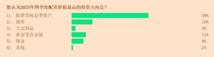调查显示,在大类资产配置方面:59%的投顾认为股票等权益类资产是四季度配置价值最高的资产;16%的投顾认为债券的配置价值最高。