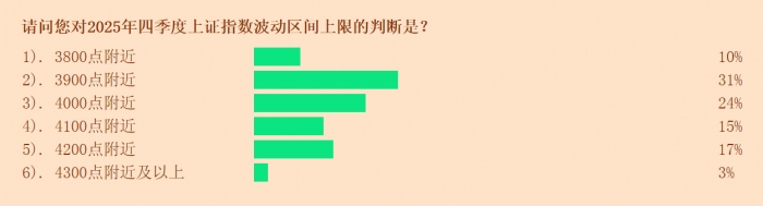 对于四季度上证综指的运行上限,受访投顾预测的点位主要集中在3900点和4000点。其中,31%的投顾判断指数的上限在3900点附近,24%的投顾预测上限在4000点附近。此外,分别有15%和17%的投顾预测,上限在4100点和4200点附近。