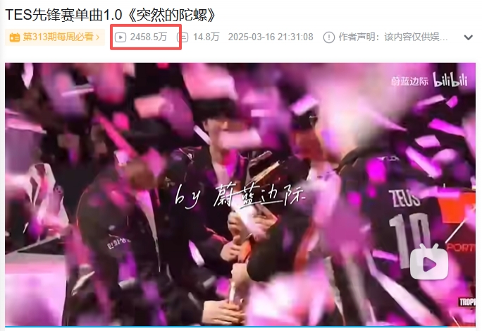 直播吧11月6日讯在S15全球总决赛八强赛上,TES以0-3的比分不敌T1,赛后B站整活歌曲《突然的陀螺》突破两千万播放量,而截止目前该视频的播放量已达2458万,超越了此前神曲《孤泳者》!