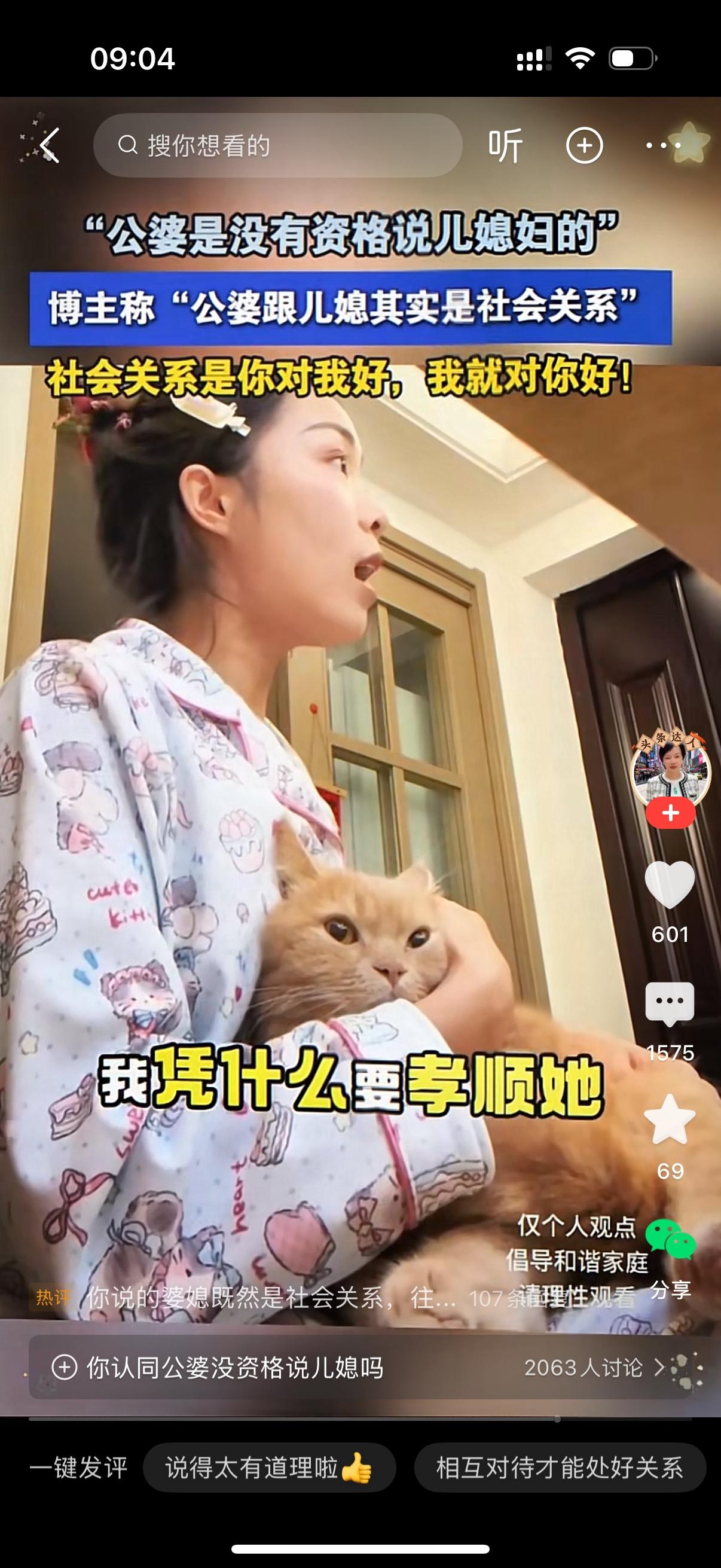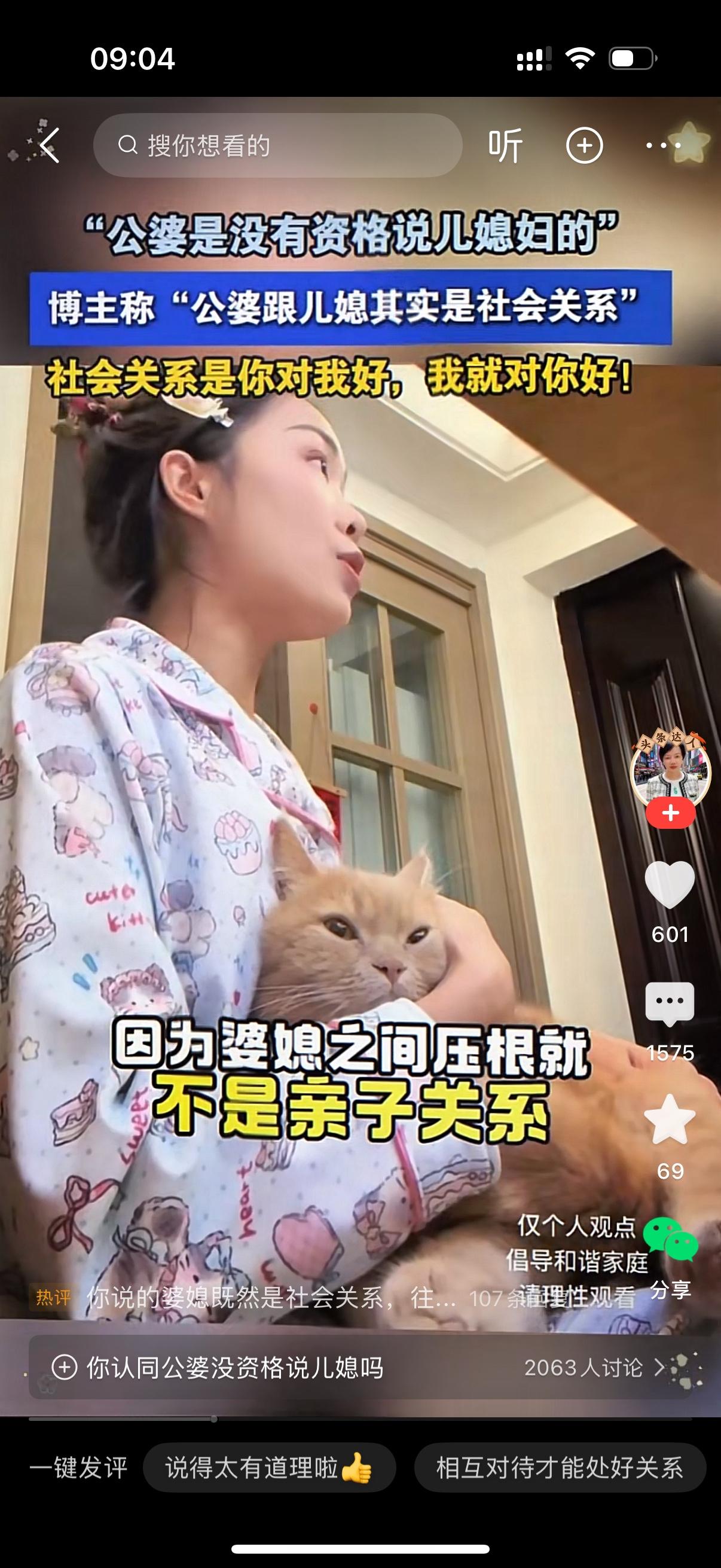女子振振有词,公婆是没有资格说儿媳妇的。因为婆媳之间压根就不是亲子关系,只是一种社会关系。社会关系就是你对我好,我就对你好。你对我不好,我就可以对你不好。公婆没有养我,我凭什么要孝顺她? 请问女子,你要彩礼,要五金,要老人给你带小孩的时候。你又该怎么说?