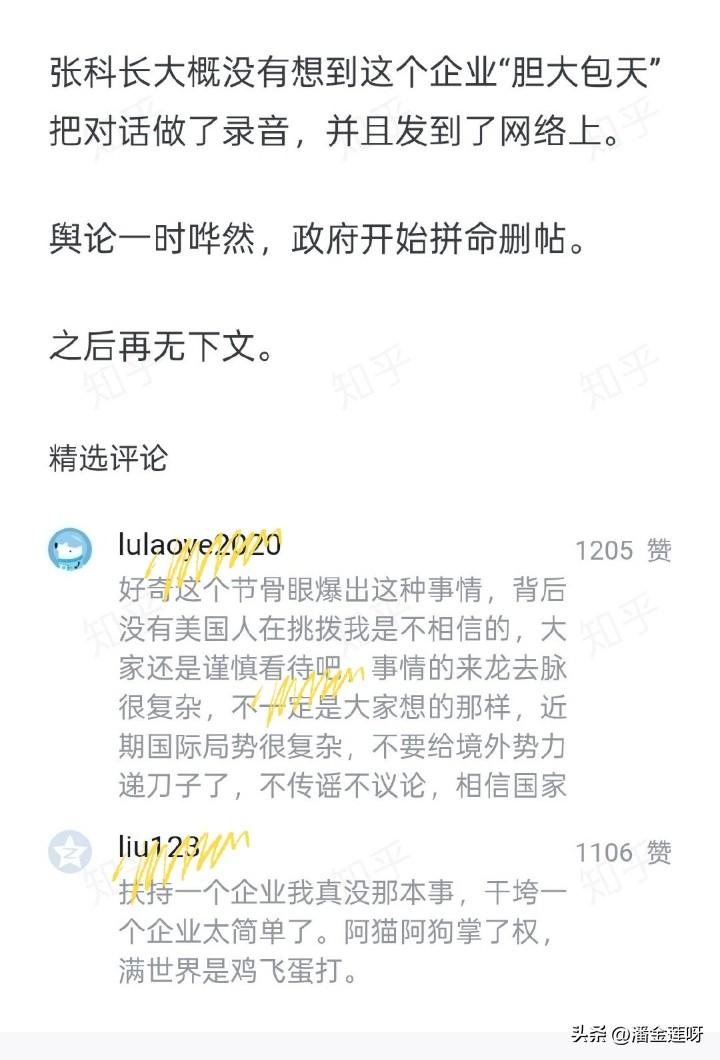 张科长那句:“我告诉你们,扶持一个企业我真没那本事,干垮一个企业太简单了。抓住一点小问题,一放大,这个企业就完了”这句话本身就足够令人瞠目结舌。 但更令人瞠目结舌的是底下第一条评论:“背后没有美国人挑拨我是不相信的……”。 可能这个人认为他生活中所有的苦难与不如意都来自于美国。他也从来都不愿意去思考当我们还过着茹毛饮血的农耕生活时,美国已经完成了蒸汽机革命。 他也从来不愿意去思考他今天能够拿着手机在互联网上咒骂美国的行为恰恰是美国赋予他的。 真正是阿Q遍地的社会,可怜至极。 美国