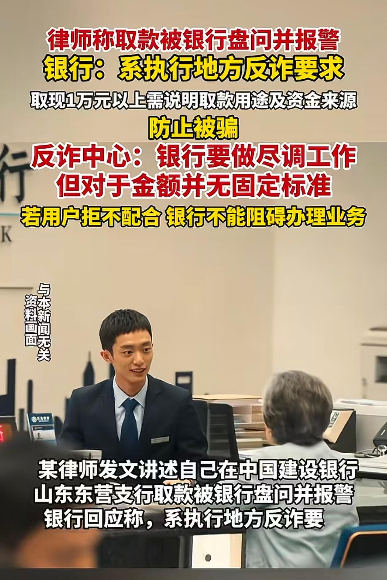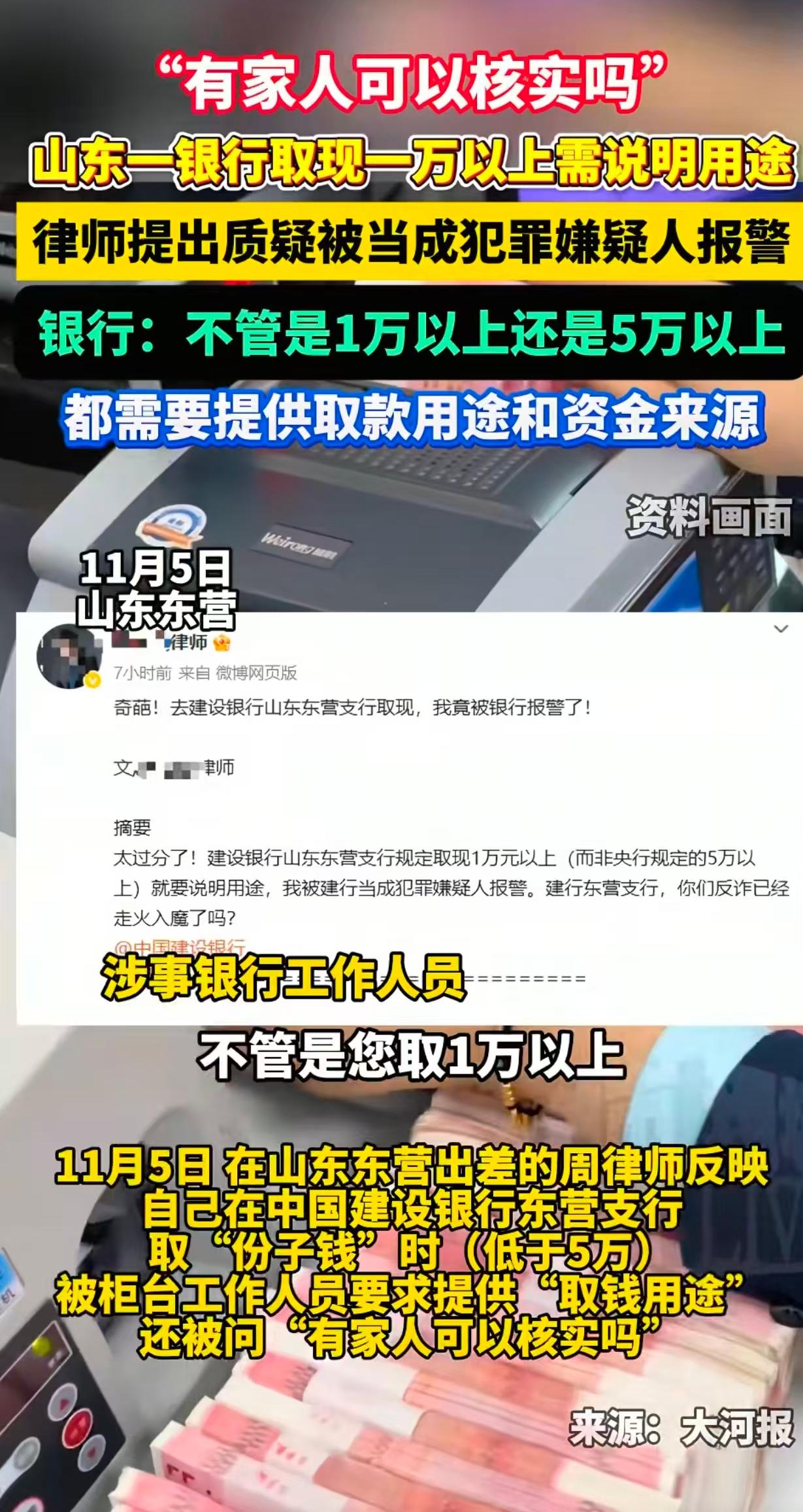 周律师这是和银行杠上了,为了给朋友结婚赶礼,竟然被银行工作人员报帽子叔叔。 周律师出差外地,当天他取钱是低于5万,银行要求他说出取款用途,他给银行说,按规定的5万以上才说用途,银行说超过1万就要说明用途。 不过他觉得多一事不如少一事,还是说是个人消费,银行工作人员追问,消费明细是什么,周律师无奈说是朋友结婚,随礼,银行工作人员又说,要让亲戚朋友帮他证明,周律师觉得不可思议,觉得银行这也管得太宽了吧。 更奇葩的是,银行看到上个月有一笔几千元的收入,也问周律师这是怎么回事。 双方僵持一会儿,工作人员便打了反诈中心电话,但是没接通,还找了帽子叔叔,周律师无奈等了半个小时,都没人来,他也不敢离开。 中间还有人在说,银行是为了大家好,让配合银行,但是周律师觉得低于5万的取现,银行这是层层加码。 不过对于银行人员说,有时候觉得自己干的工作自己都想笑,这个确实是个尺度问题,有人损失1w就影响生活,有人损失10w,也无所谓。怎样把握这个度确实要研究!