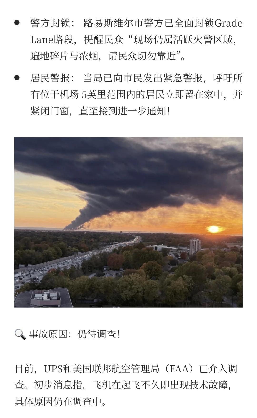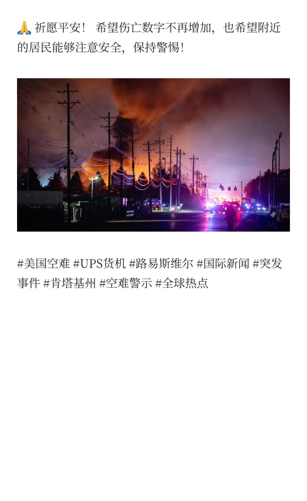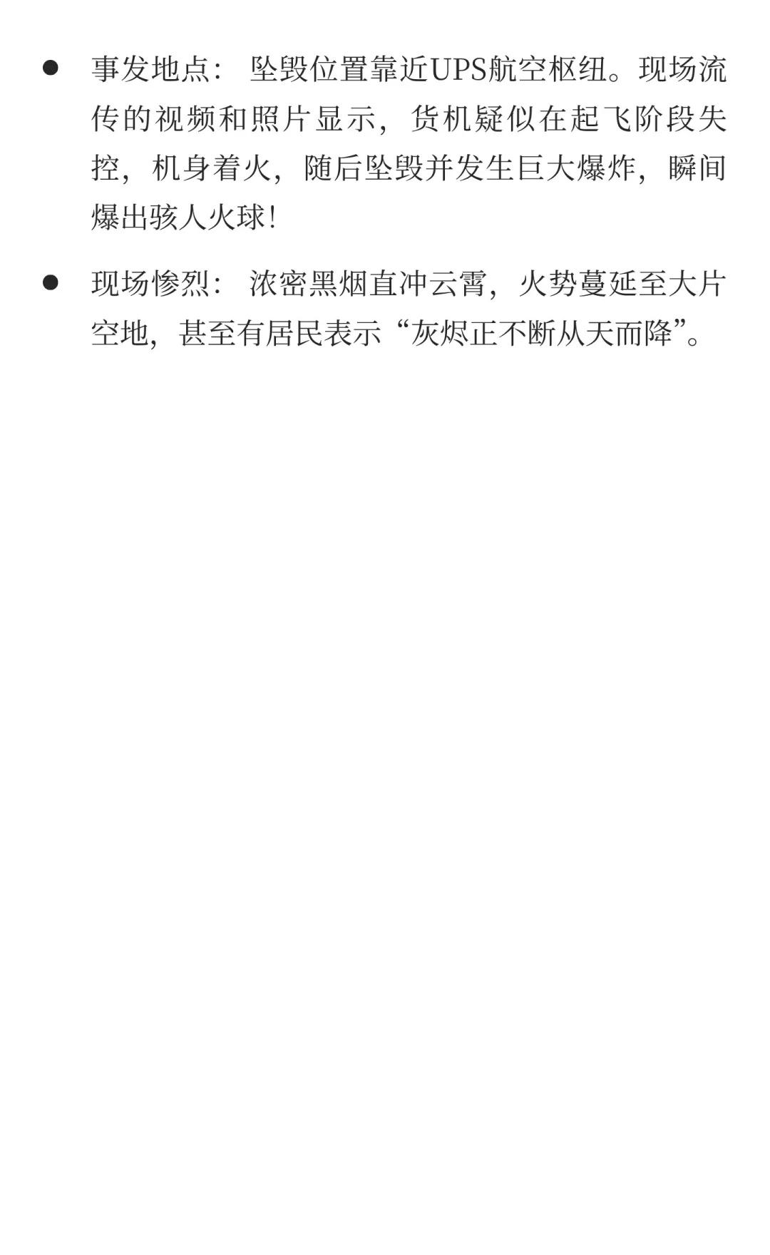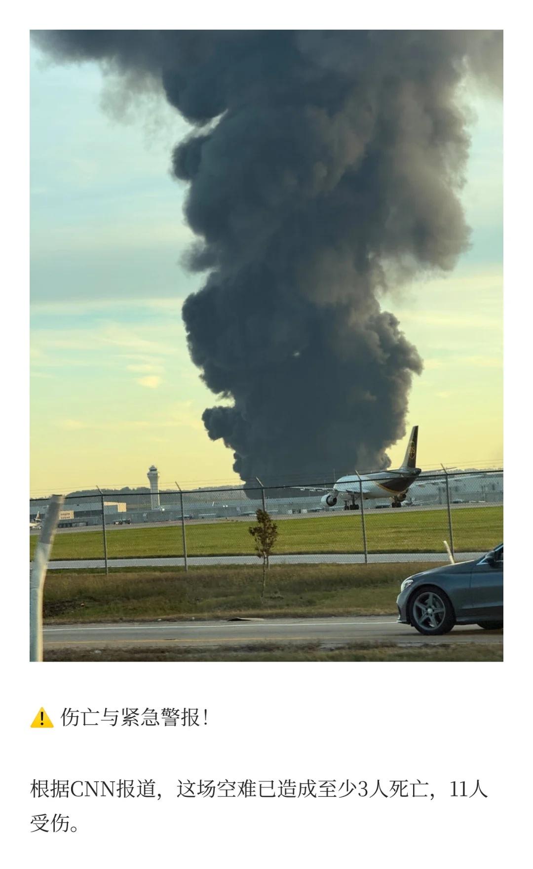 美国重大空难!UPS货机坠毁机场附近爆炸! 美国UPS一架MD-11型货机于周二傍晚在肯塔基州路易斯维尔国际机场附近坠毁爆炸。空难已造成至少3死11伤。据信货机在起飞阶段失控,现场浓烟直窜天际,情景骇人。当局已发出紧急警报,要求方圆5英里居民立即留在家中。事故原因仍在调查中。热点新闻事件 飞机 空难 坠毁