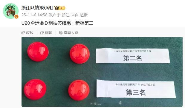 浙江U20队与新疆U20队在积分、净胜球、总进球和红黄牌数量上完全一致,需要通过抽签决定晋级球队。