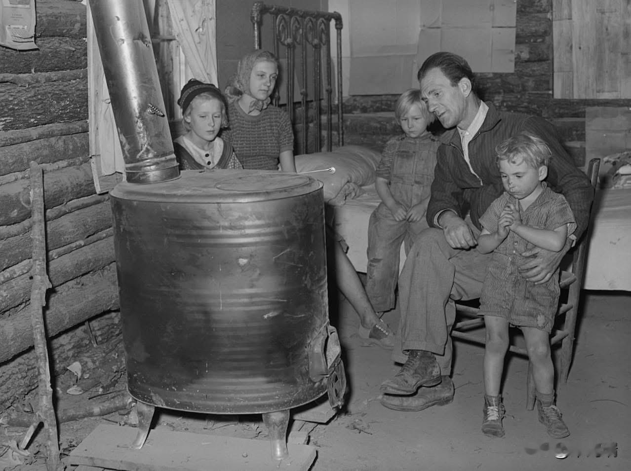 这幅照片拍摄于 1939年,地点是美国密苏里州巴特勒县的一个临时营地,拍摄对象是一户被驱逐的佃农家庭。这家人当时正围着一个由桶制成的炉子取暖。这张照片是美国政府机构“农业安全管理局”(FSA)为记录大萧条时期的生活状况而拍摄的系列照片之一。