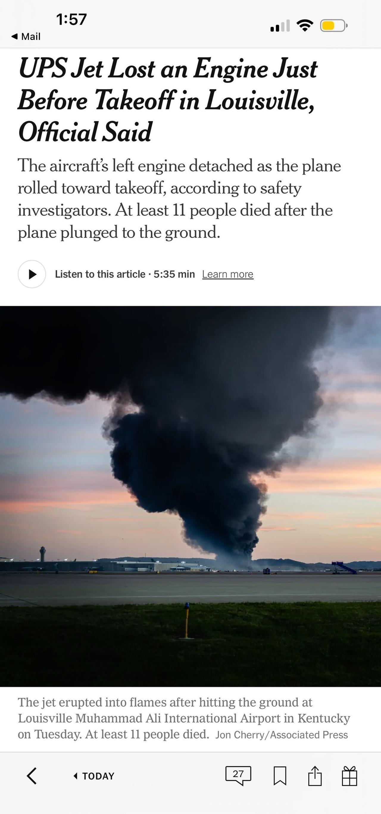fzz:路易斯维尔空难死亡人数增加到至少11人,另有15人受伤,成大事故了。飞机刚起飞一个引擎脱落,飞机掉到了炼油厂引起大爆炸。