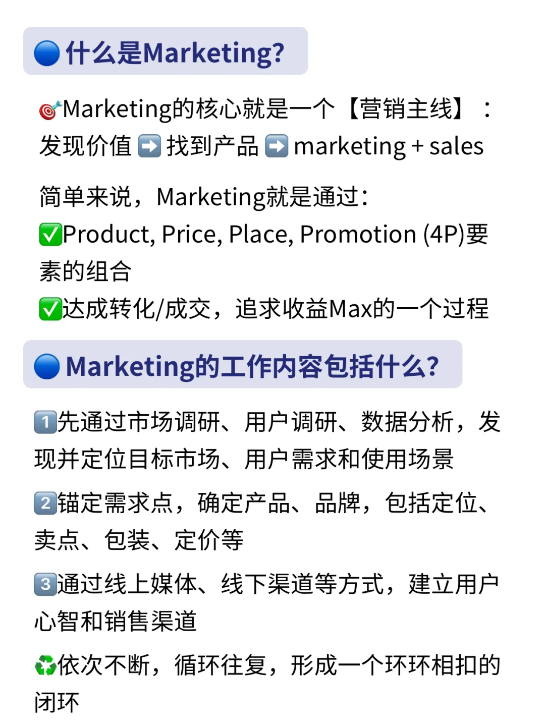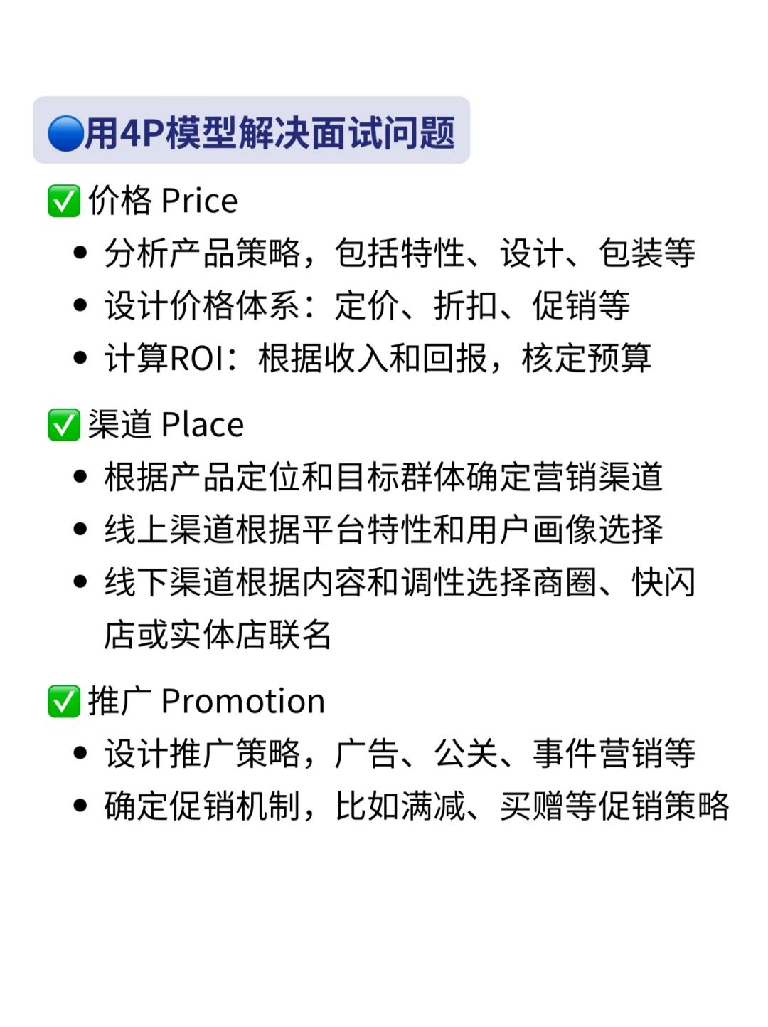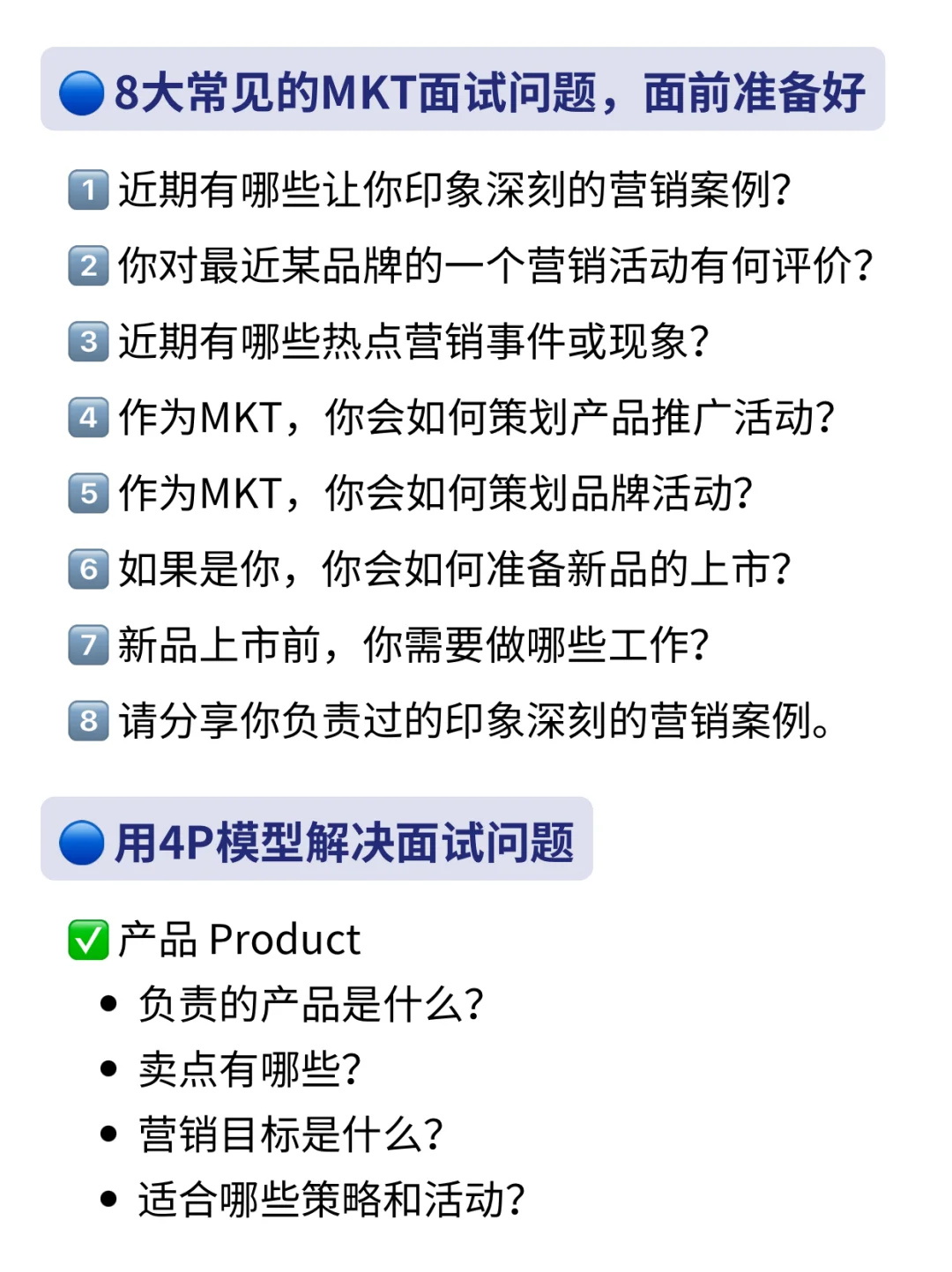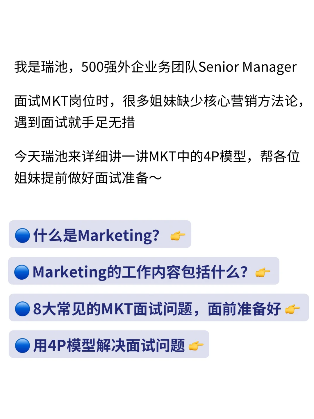 我是瑞池,500强外企业务团队Senior Manager · 说到面试MKT岗位,我发现不少小伙伴对核心营销方法论心里没底 · 今天就想和大家理一下“4P模型”​​,咱们一起搞懂它 · 一、先说根本:Marketing到底是什么? Marketing的精髓就是用一条清晰的营销主线串联一切: 👉发现市场需求 → 匹配产品 → 通过营销+销售实现价值转化 · 在业务中,Marketing的核心工作就是巧妙组合4个关键​​完成转化、让公司收益提升 · 二、Marketing日常具体干点啥?(和4P都有关) 结合我的观察和实践,工作内容通常是这样一步步落地的: 1️⃣挖需求,找准人 别小看这一步!得靠细致的市场调研、用户访谈、数据深挖​,真正摸清楚:咱的目标用户是谁?他们究竟痛在哪里?什么场景下需要咱的产品/服务?​这一步挖得多深,决定了后面能做多准 · 2️⃣定产品,打品牌 锁定了核心需求,就得打磨产品本身了:包括品牌定位、突出什么核心卖点、产品设计包装怎么吸引人,以及最关键的——​定一个有竞争力的价格策略。这些都得基于前面调研的成果 · 3️⃣搞传播,铺渠道 好东西得让人知道!这就得通过线上各种媒体推广/社交平台种草、线下渠道铺设/合作等方式,​在目标用户脑子里“种草”​​,同时确保他们想买的时候能方便地买到。​说白了,既要吸引人,更要让人买得到 · ▪️更重要的是,这可不是干一次就完事儿! 发现用户反馈不好?市场变了?咱们得马上回到step1,重新研究、调整策略,形成一个不断滚动升级的闭环 · ▪️Marketing的本质,就是个“滚雪球”的过程! · 三、用4P模型解决面试问题(具体内容👀看上图‼️) · 🙋‍♂️我是瑞池,500强外企总部Leader+面试官 👉(求职版) 看更多求职干货笔记 -