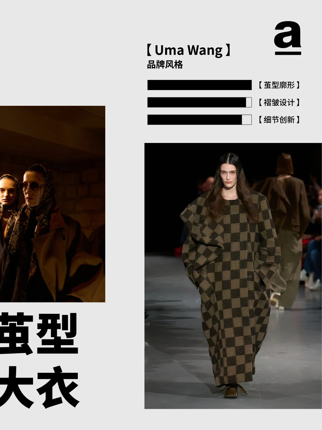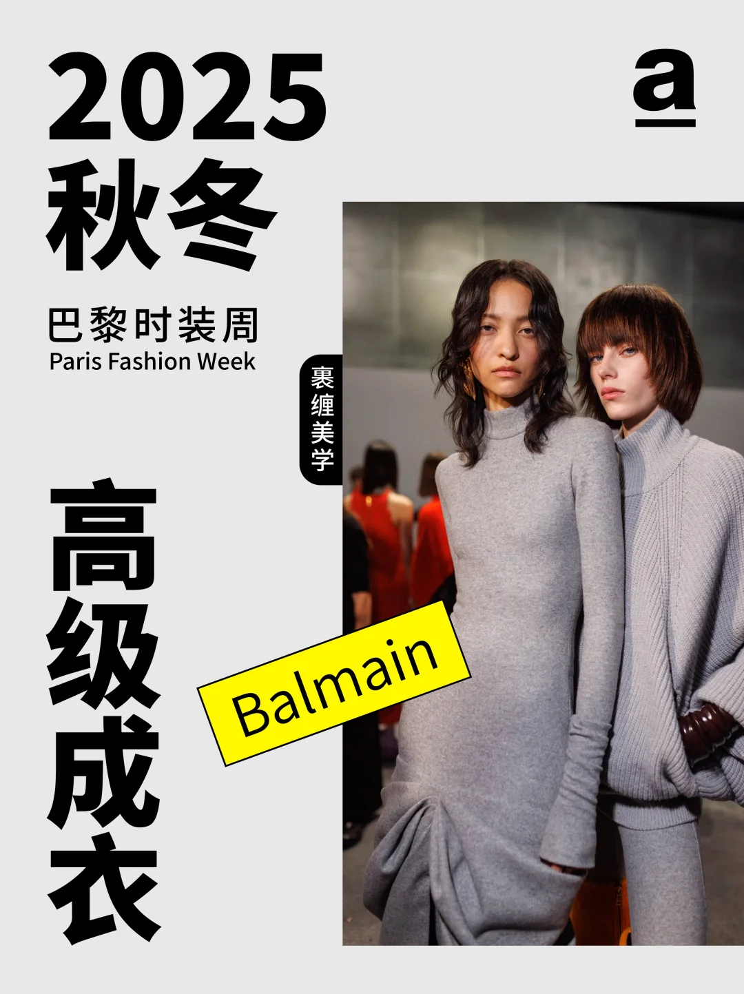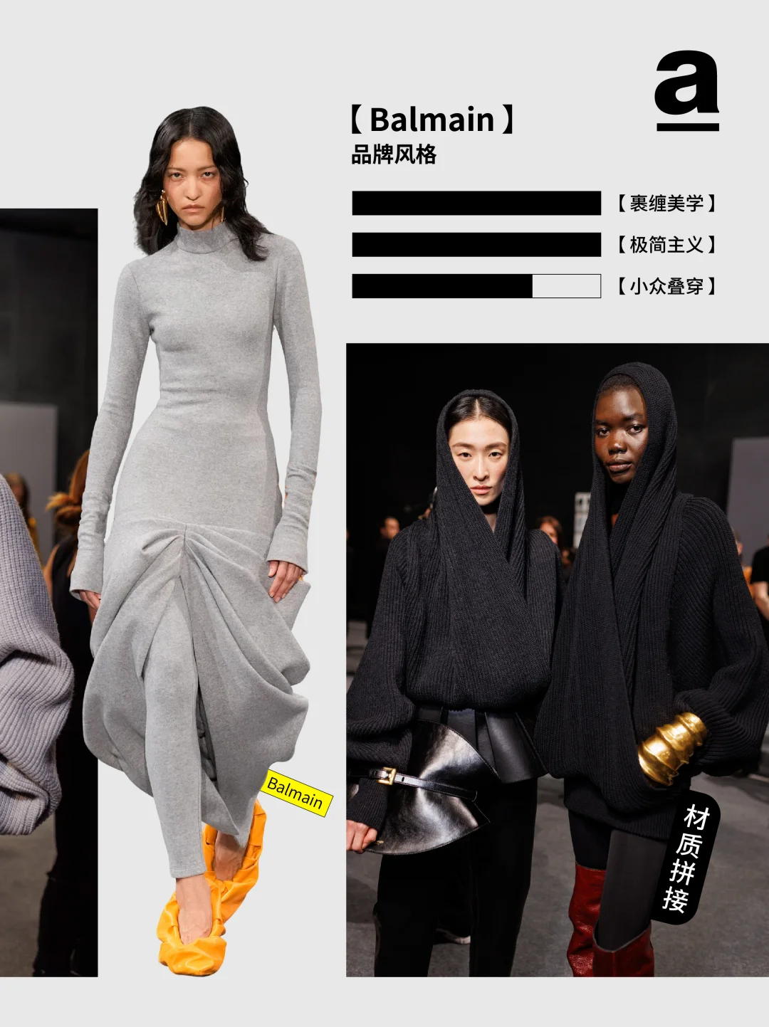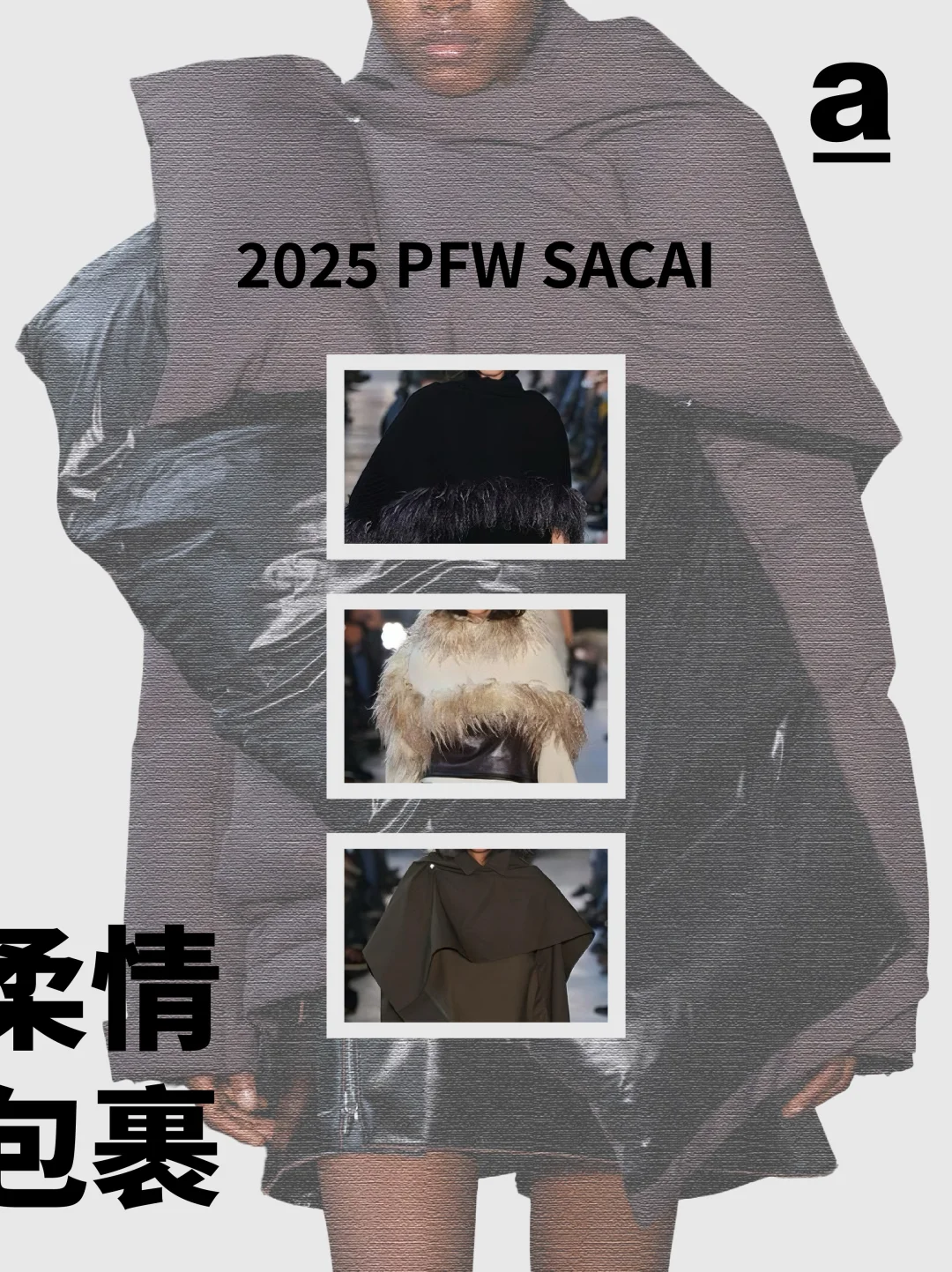 当下的茧型与裹身趋势——茧型消解裹身的束缚感,裹身弥补茧型的松散感,二者在面料肌理、比例控制与工艺细节中找到平衡。那两个曾独立游走于时尚史的廓形正以共生的姿态诉说新故事... 2024/25秋冬巴黎时装周上,茧型的包容廓形与裹身的贴合肌理形成奇妙共振。茧型源自 Balenciaga 创始人 1947 年的 “桶形” 设计,而裹身灵感来自东方缠绕美学,设计师们打破两者的风格边界,通过面料创新、结构重组与功能融合,让这对看似对立的元素成为诠释当代时尚的核心语言,催生兼具舒适与张力的穿搭新范式。 【关键品牌】 「Balmain」 宽松的茧型针织裙自带柔和包裹感,羊绒与羊毛混纺面料贴合身形。并保留品牌的力量感,在茧型大衣上搭配超大翻领与斑马纹拼接,冷灰色调凸显高级质感。 「Sacai」 把超大号茧型外套包覆在常规款之外,通过交错折叠实现裹身感。夸张的立体口袋强化轮廓层次,让裹身结构兼具实用性。 「Uma Wang」 用东方视角重构茧型与裹身,以文艺复兴雕塑为灵感,打造松弛茧型轮廓,自然褶皱与不规则剪裁实现“隐性裹身”效果。 「Thom Browne」 茧型大衣模仿桶胸鹟的胸骨曲线,红白蓝粗花呢与羽毛丝线碰撞,让廓形组合有学院风的规整,又有超现实主义的浪漫。 茧型是都市人需要的温柔庇护,裹身是不愿放弃的自我表达,而巴黎的设计师们,恰好找到了两者对话的密码。