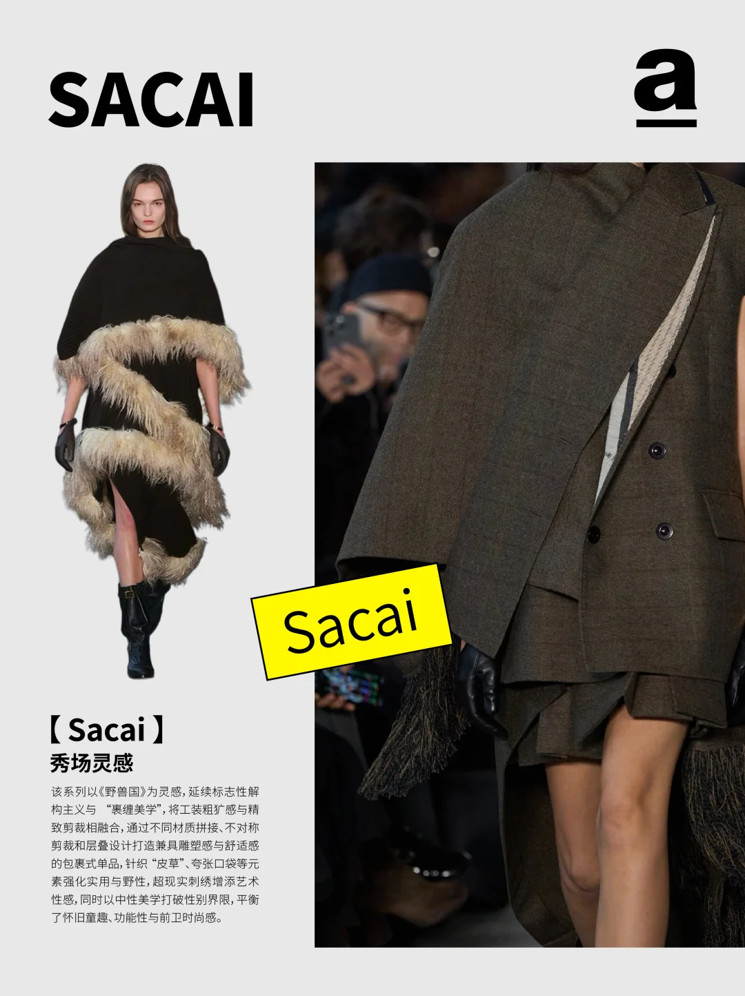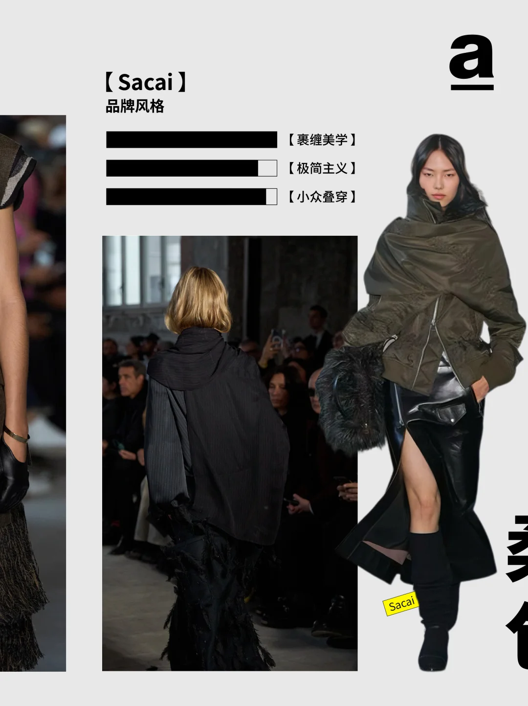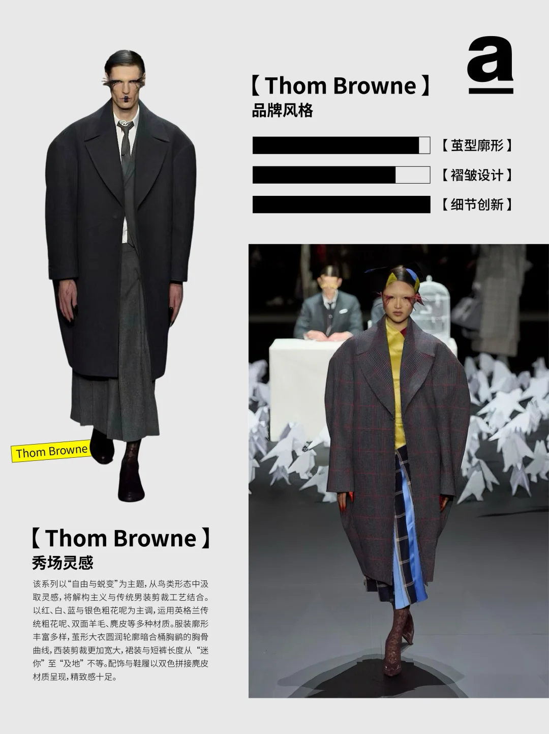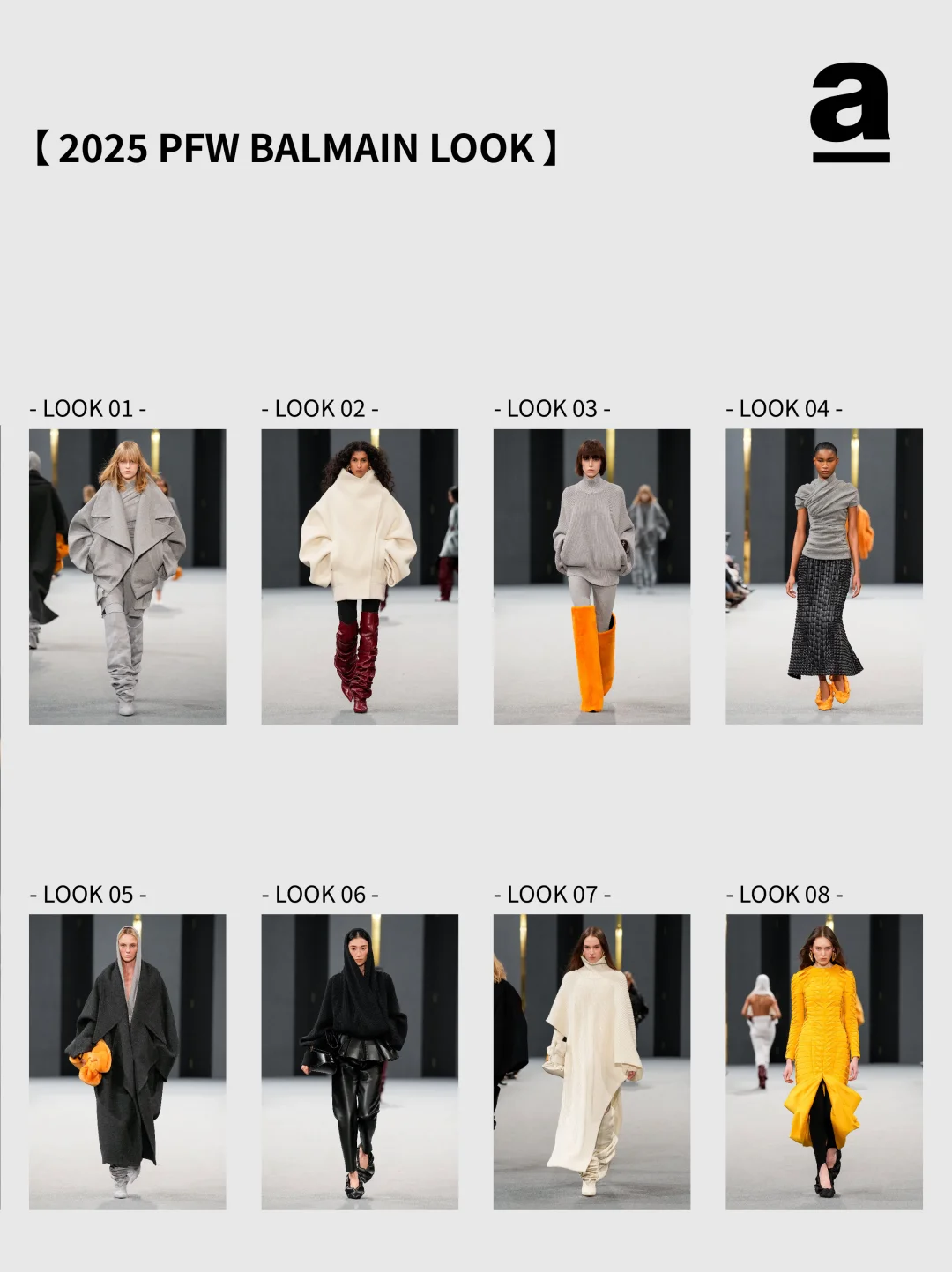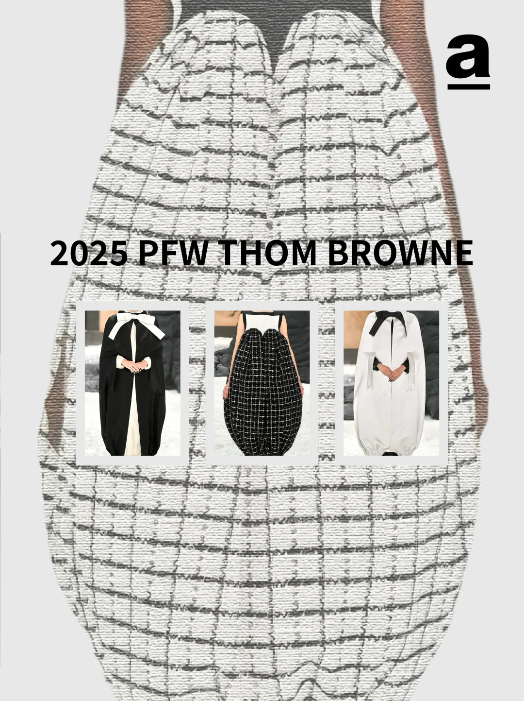 当下的茧型与裹身趋势——茧型消解裹身的束缚感,裹身弥补茧型的松散感,二者在面料肌理、比例控制与工艺细节中找到平衡。那两个曾独立游走于时尚史的廓形正以共生的姿态诉说新故事... 2024/25秋冬巴黎时装周上,茧型的包容廓形与裹身的贴合肌理形成奇妙共振。茧型源自 Balenciaga 创始人 1947 年的 “桶形” 设计,而裹身灵感来自东方缠绕美学,设计师们打破两者的风格边界,通过面料创新、结构重组与功能融合,让这对看似对立的元素成为诠释当代时尚的核心语言,催生兼具舒适与张力的穿搭新范式。 【关键品牌】 「Balmain」 宽松的茧型针织裙自带柔和包裹感,羊绒与羊毛混纺面料贴合身形。并保留品牌的力量感,在茧型大衣上搭配超大翻领与斑马纹拼接,冷灰色调凸显高级质感。 「Sacai」 把超大号茧型外套包覆在常规款之外,通过交错折叠实现裹身感。夸张的立体口袋强化轮廓层次,让裹身结构兼具实用性。 「Uma Wang」 用东方视角重构茧型与裹身,以文艺复兴雕塑为灵感,打造松弛茧型轮廓,自然褶皱与不规则剪裁实现“隐性裹身”效果。 「Thom Browne」 茧型大衣模仿桶胸鹟的胸骨曲线,红白蓝粗花呢与羽毛丝线碰撞,让廓形组合有学院风的规整,又有超现实主义的浪漫。 茧型是都市人需要的温柔庇护,裹身是不愿放弃的自我表达,而巴黎的设计师们,恰好找到了两者对话的密码。