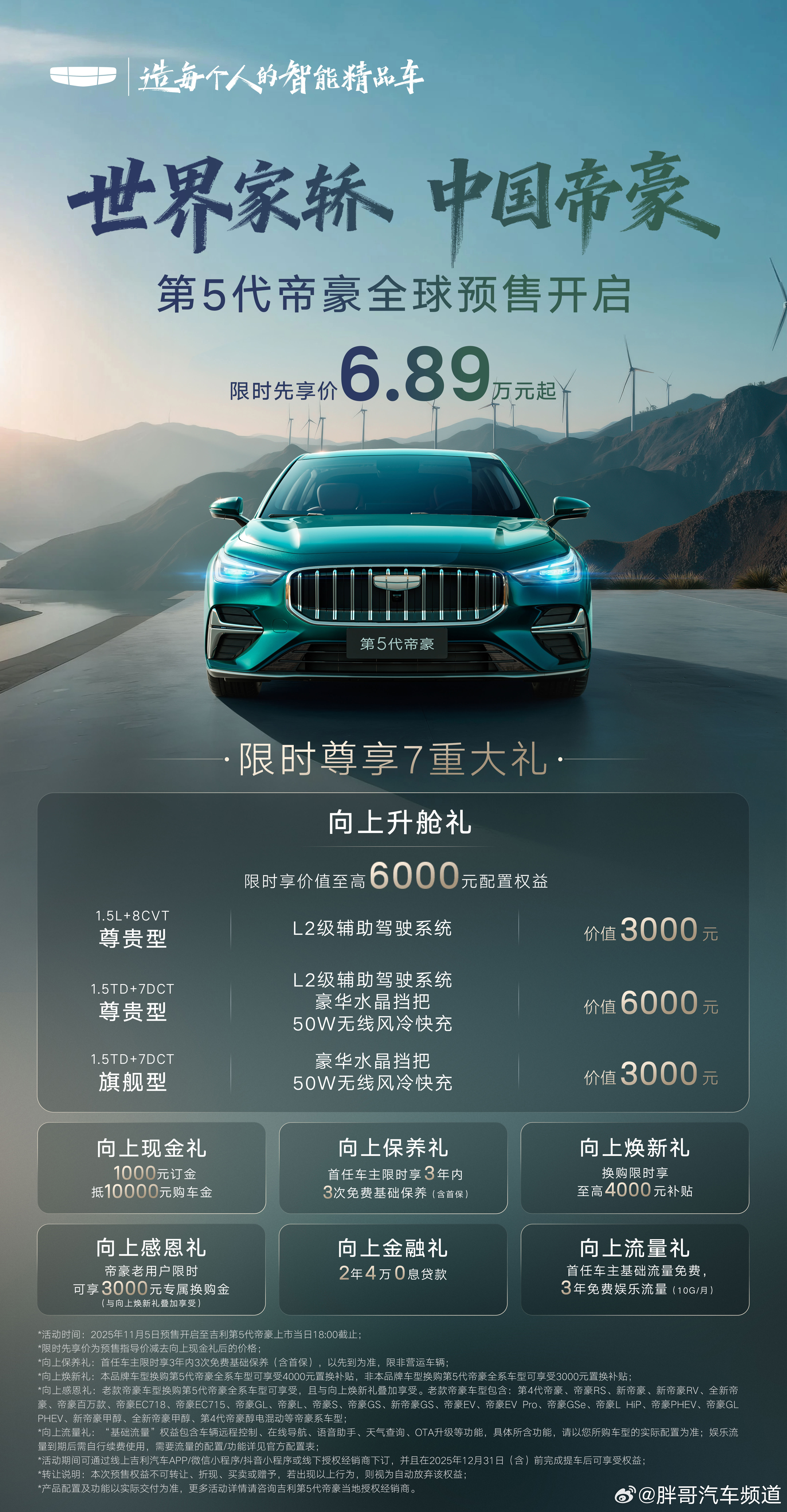 胖哥汽车频道[超话]第5代帝豪 全球预售开启,共4款车型,限时先享价6.89-8