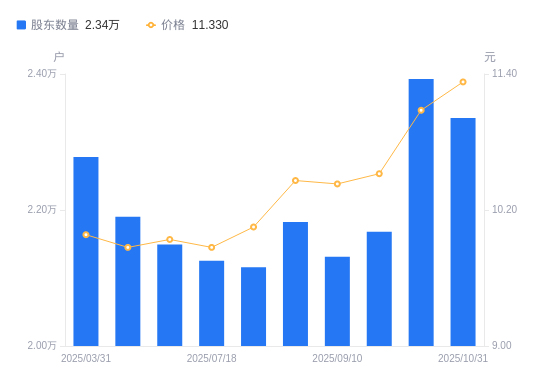 近一年(2024年12月31日至2025年10月31日),万盛股份A股股东户数从2.29万户,增加至2.34万户,增幅2.03%,区间股价上涨9.03%。