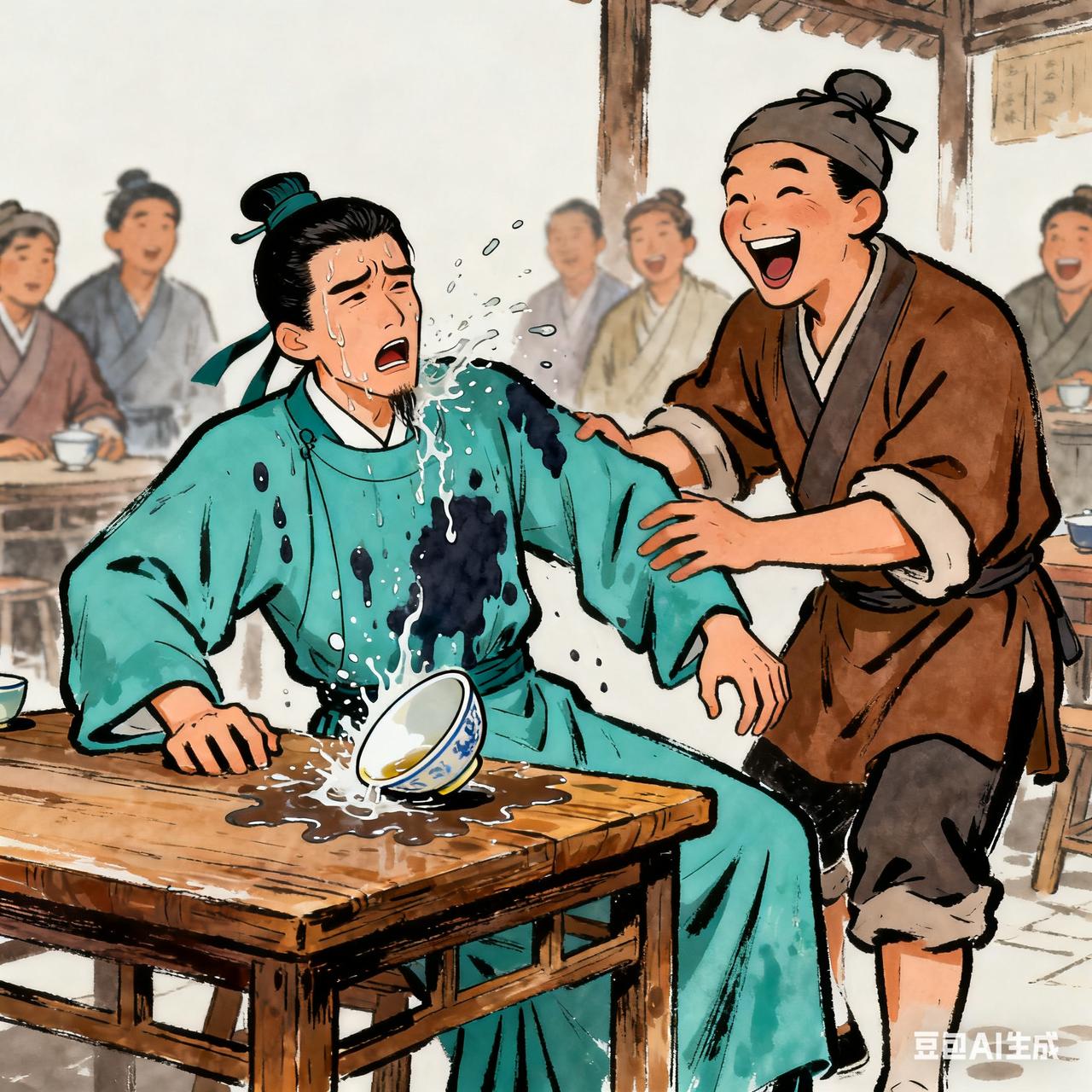 古代笑话 一日秀才去茶铺喝茶, 见小二端着茶壶过来,忙拱手道: “敢问小二,此乃‘茗’之哪山所产? 需‘孔方兄’几许?” 小二是个急性子,翻了个白眼: “啥茗不茗的? 这是后山的野茶!五文钱一碗! 酸文假醋的,喝不起就别喝!” 秀才涨红了脸摸钱, 刚坐下,见茶沫浮在碗上,又皱眉道: “茶有‘沫’者,需‘撇之’方显雅致, 你这般粗疏,难怪……” 话没说完,抬手去撇茶沫, 手肘却撞翻了茶碗,茶水泼了一身。 小二在旁笑了: “先生这是‘手忙脚乱,茶湿其衫’? 要我说,不如喊声‘给我来碗茶’, 省得烫着!”民间小笑话