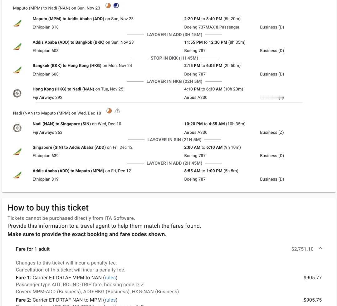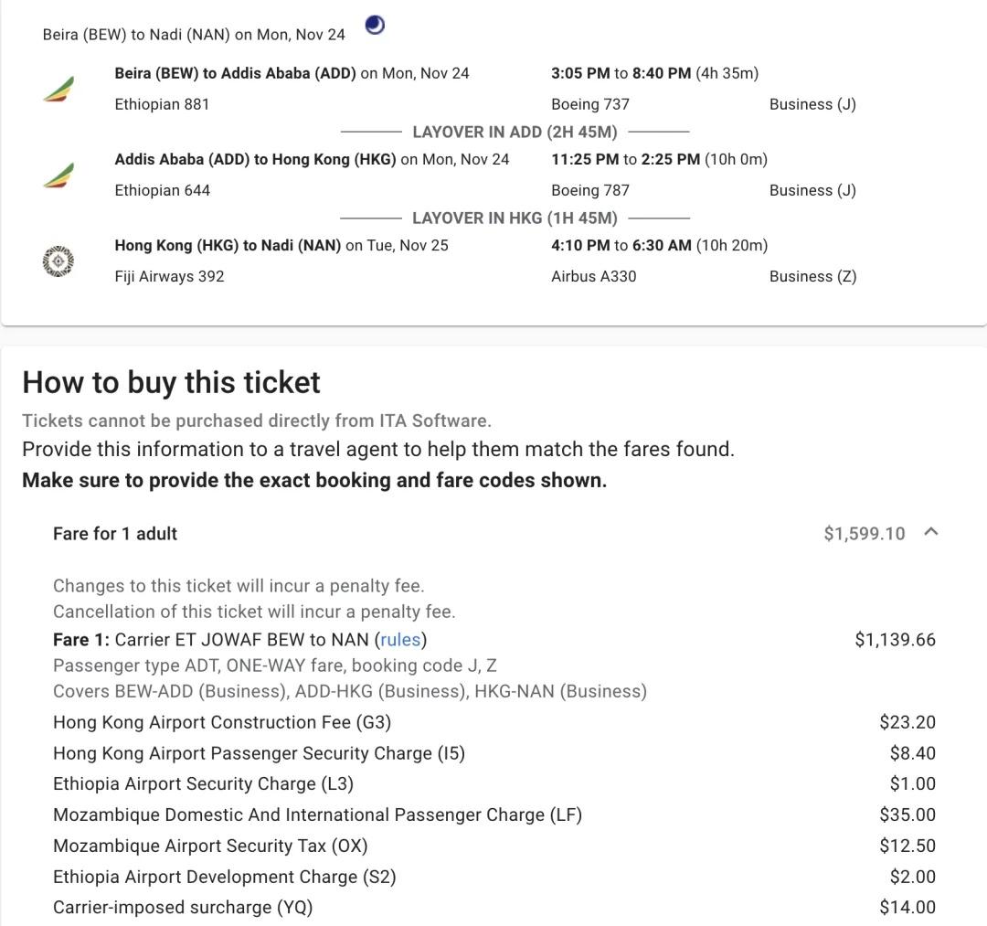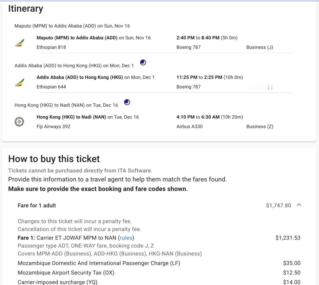 这种离奇的机票,到底都是谁在飞啊? 全球为数不多的那些个大都市,汇聚了大部分的人员往来及民航需求 但有时,航空公司会给几个莫名其妙的城市对,制定一些定价不错,玩法也很超乎想象 但全世界大部分人都用不上的离奇票规 比如,我们今天要介绍的这份 *** 这是埃塞俄比亚航空发布的,莫桑比克(马普托或者贝拉)始发,飞往斐济楠迪的商务舱票规 估计不少人和我一样,都是初次听闻贝拉这个地名的存在 还得在地图上仔细寻找一番,才能知道其具体位置 单程:JOWAF,税前约1160美金,含税约1600美金(图2 & 图4),¥1万3左右(图3) 往返:DRTAF,税前约1801美金,含税约2750美金(图5),近¥2万2 【路线】 莫桑比克 > 阿塞俄比亚 > 香港或新加坡 > 斐济楠迪 (图1) 单程约2万公里,相当于北京飞了个洛杉矶往返 【航司】 进出斐济,斐济航执飞 其余航段,埃塞航自家执飞 【停留】 可在任意转机点停留任意时长 不过在阿塞俄比亚停留,每次有90美金停留费 *** 虽然定价好,停留慷慨 但想必大部分人都只是看热闹的,不太会去亲自去飞 但万一你真有需求(至少单程的需求),那可以充分利用上停留政策,一票玩非洲+亚洲+大洋洲 如图7 & 图8,马普托始发,先后在阿塞俄比亚和香港停留数日(也可以是数月),然后飞往斐济 全程含税近约1750美金,近¥14000 你也可以把香港换成新加坡(图9),含税依然是近¥14000 转机停留 特价商务舱 埃塞俄比亚航空 马普托 贝拉 香港 新加坡