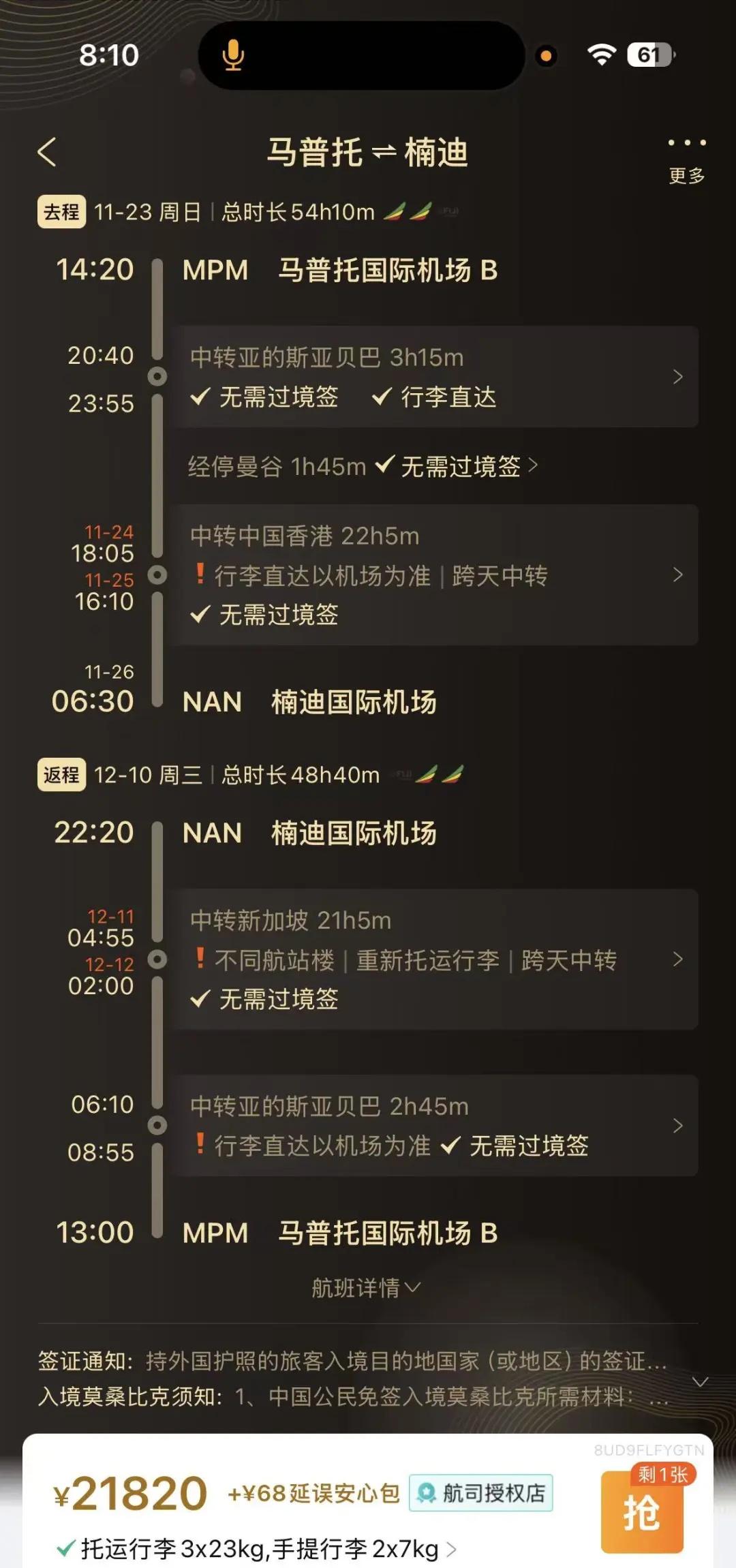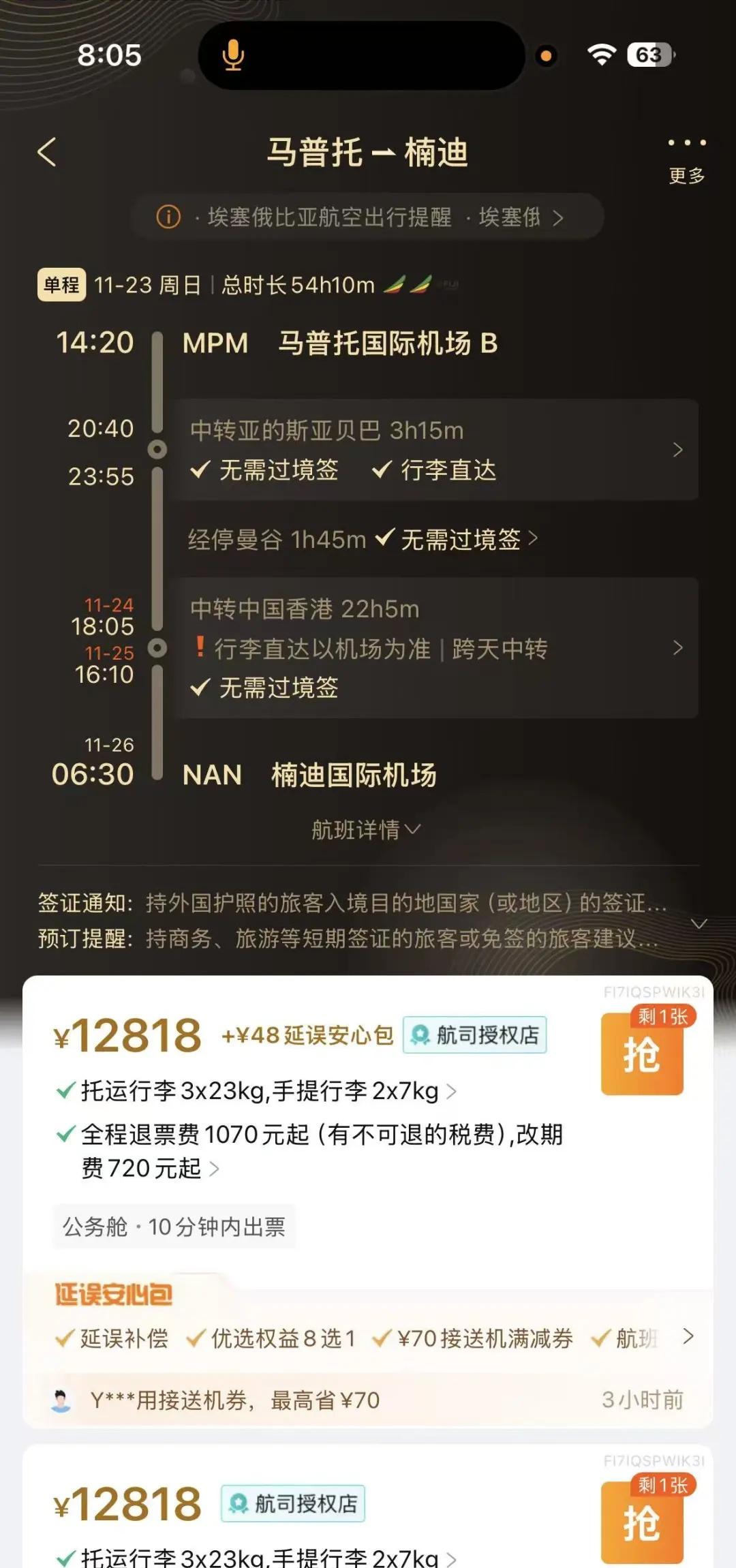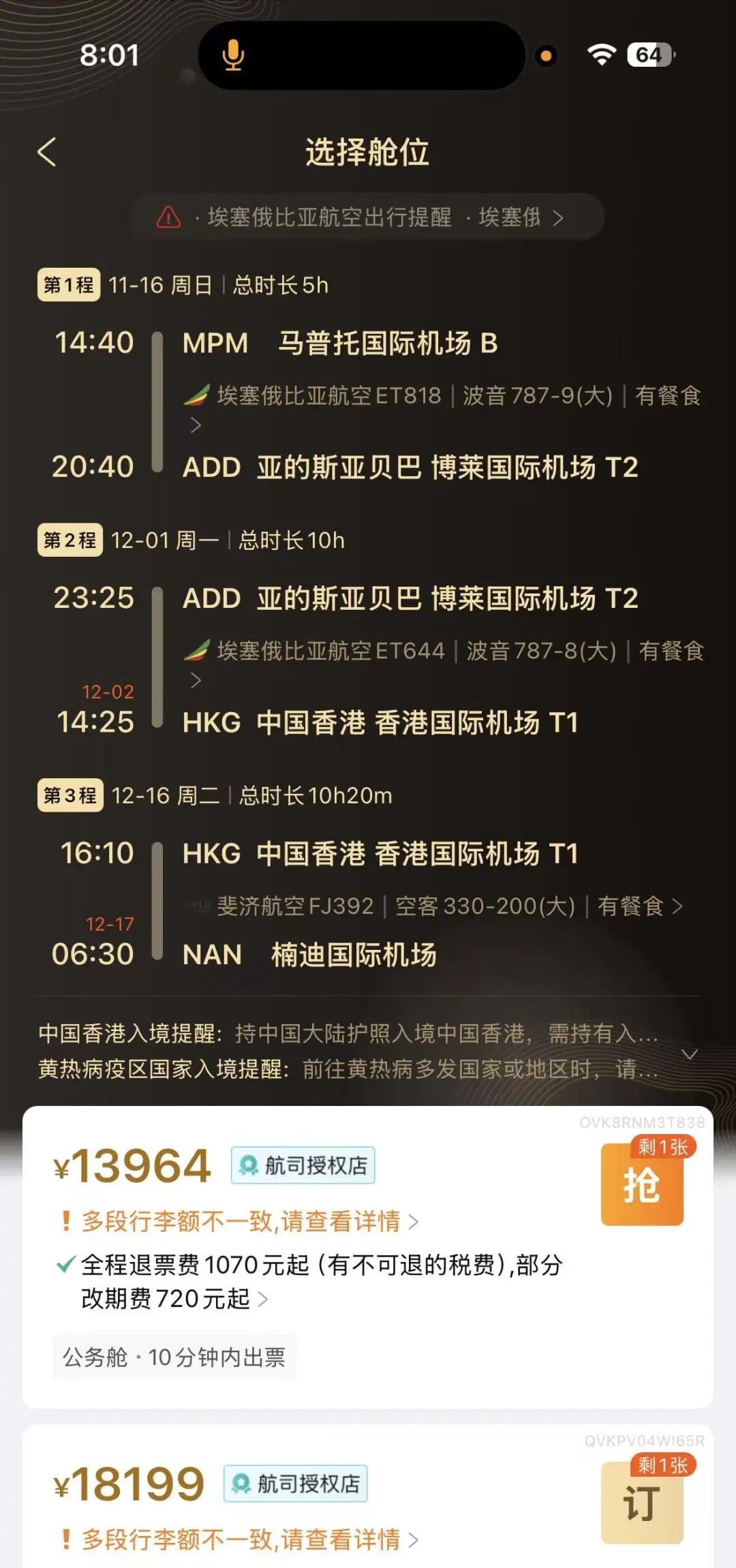 这种离奇的机票,到底都是谁在飞啊? 全球为数不多的那些个大都市,汇聚了大部分的人员往来及民航需求 但有时,航空公司会给几个莫名其妙的城市对,制定一些定价不错,玩法也很超乎想象 但全世界大部分人都用不上的离奇票规 比如,我们今天要介绍的这份 *** 这是埃塞俄比亚航空发布的,莫桑比克(马普托或者贝拉)始发,飞往斐济楠迪的商务舱票规 估计不少人和我一样,都是初次听闻贝拉这个地名的存在 还得在地图上仔细寻找一番,才能知道其具体位置 单程:JOWAF,税前约1160美金,含税约1600美金(图2 & 图4),¥1万3左右(图3) 往返:DRTAF,税前约1801美金,含税约2750美金(图5),近¥2万2 【路线】 莫桑比克 > 阿塞俄比亚 > 香港或新加坡 > 斐济楠迪 (图1) 单程约2万公里,相当于北京飞了个洛杉矶往返 【航司】 进出斐济,斐济航执飞 其余航段,埃塞航自家执飞 【停留】 可在任意转机点停留任意时长 不过在阿塞俄比亚停留,每次有90美金停留费 *** 虽然定价好,停留慷慨 但想必大部分人都只是看热闹的,不太会去亲自去飞 但万一你真有需求(至少单程的需求),那可以充分利用上停留政策,一票玩非洲+亚洲+大洋洲 如图7 & 图8,马普托始发,先后在阿塞俄比亚和香港停留数日(也可以是数月),然后飞往斐济 全程含税近约1750美金,近¥14000 你也可以把香港换成新加坡(图9),含税依然是近¥14000 转机停留 特价商务舱 埃塞俄比亚航空 马普托 贝拉 香港 新加坡