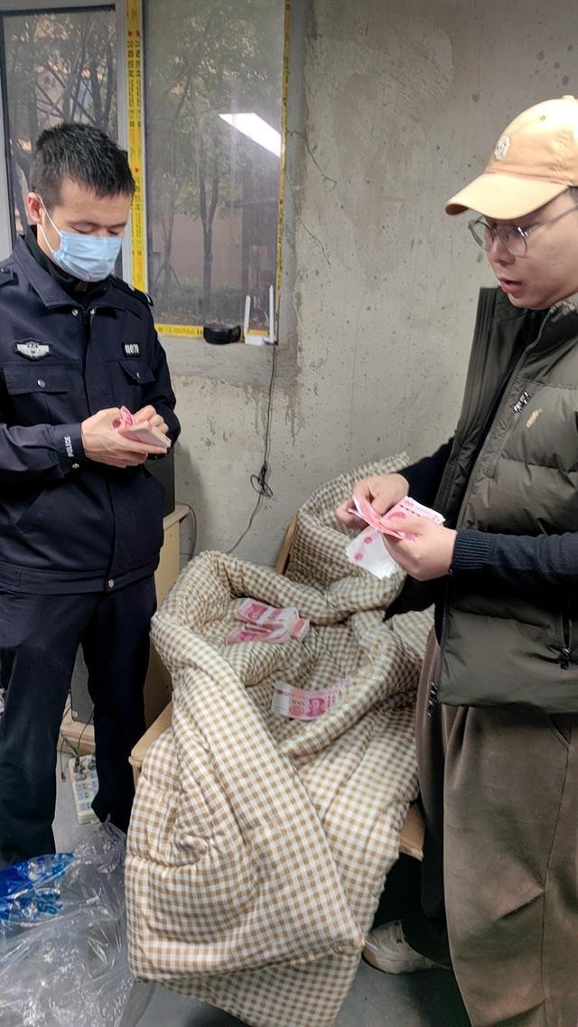 10月30日早上8时许,工作组已悄悄在物流站周边布控。分拣线启动后,民警根据单号精准锁定目标包裹。拆开外层包装,一床叠得整齐的格子棉被露了出来,民警仔细摸索,在棉被里找到了成捆的现金,清点后确认为47600元。