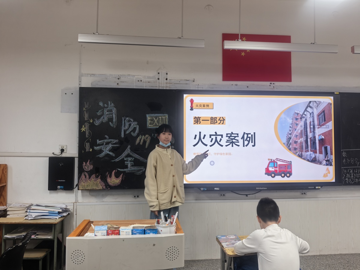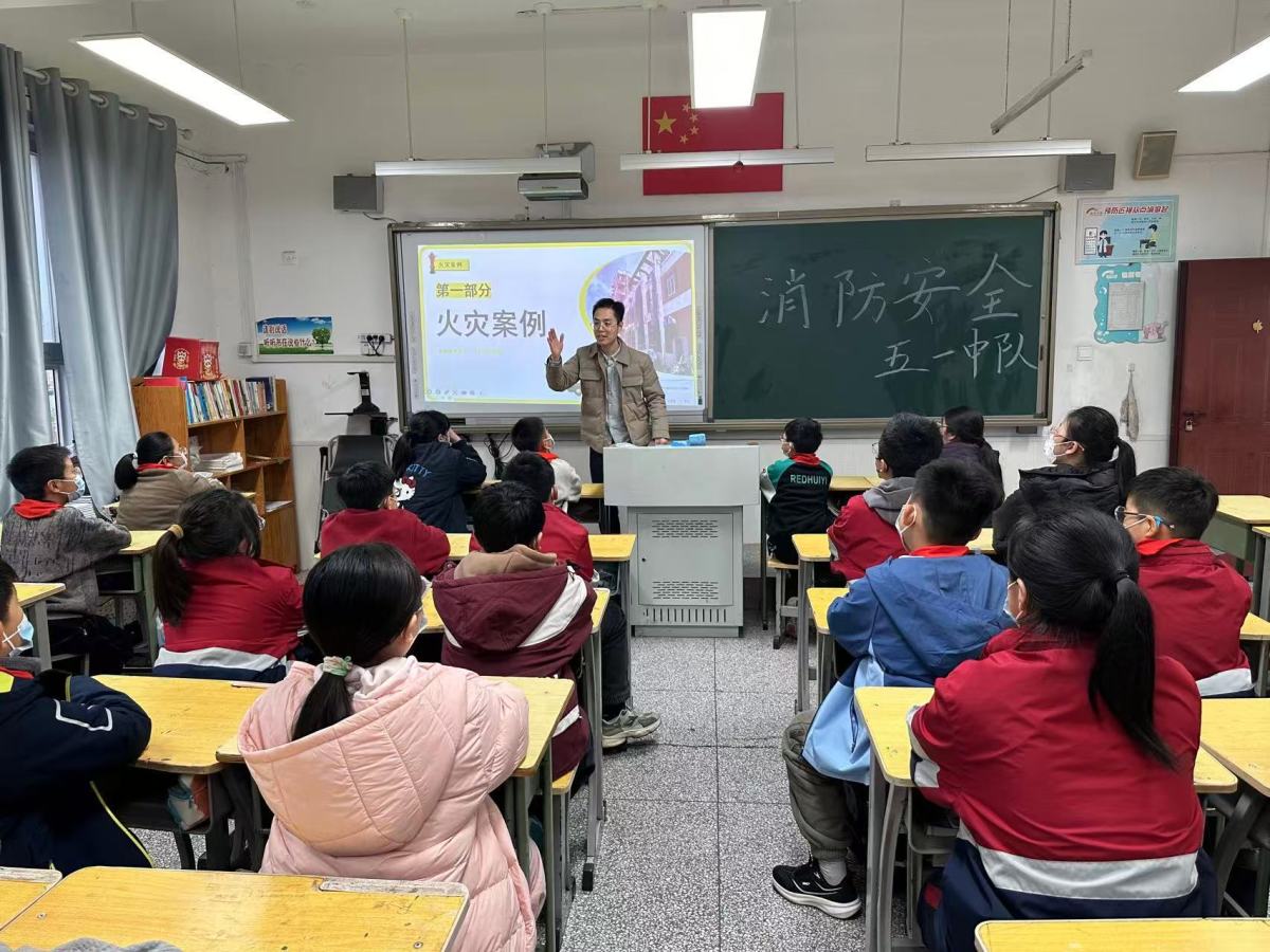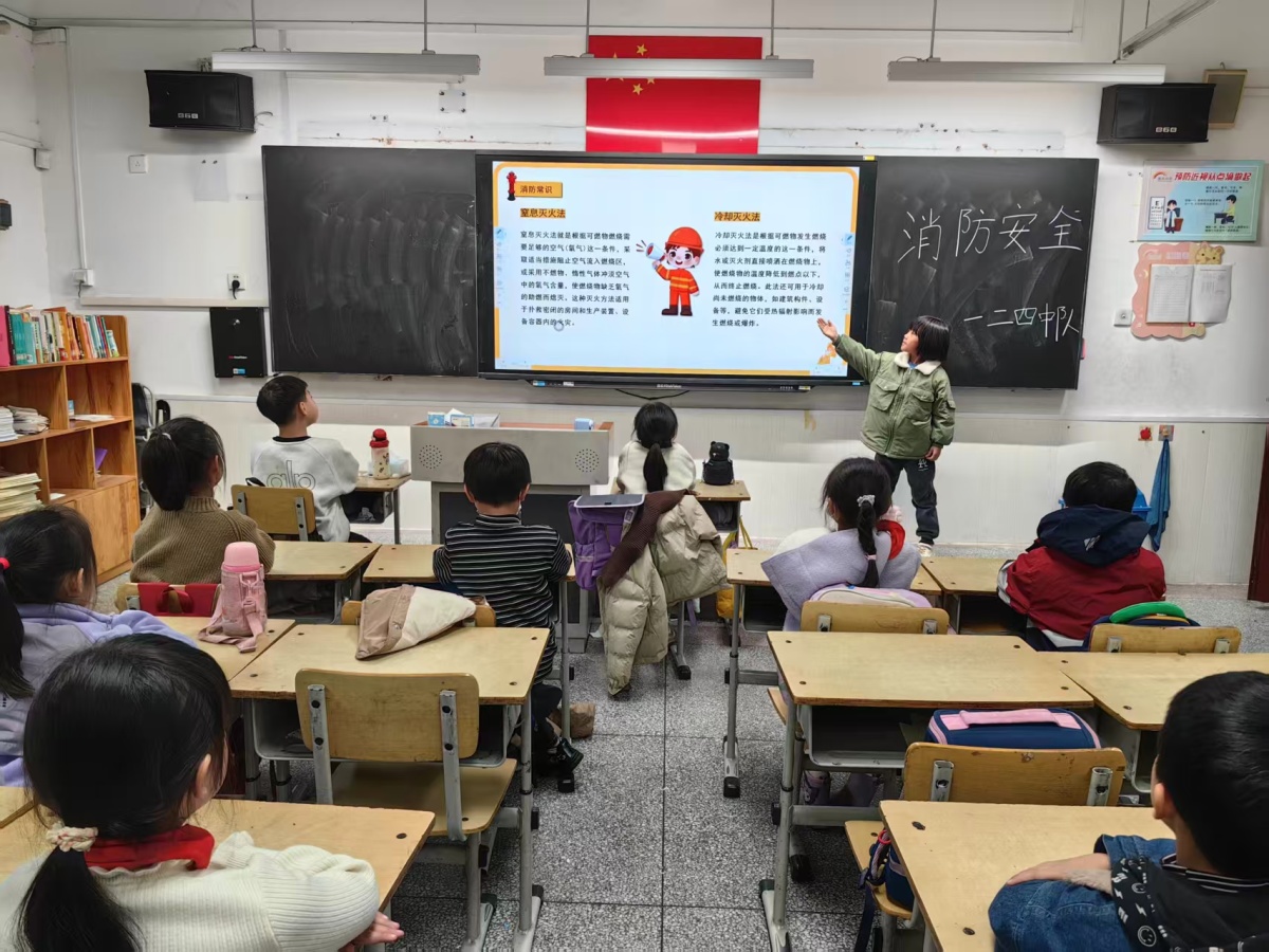 在庄重的国旗下朗诵之后,各中队积极响应大队部号召,在辅导员老师的精心组织下,开展了形式多样、内容丰富的主题队会。队会上,中队辅导员们通过播放消防安全警示教育片、展示火灾案例图片,直观地向同学们介绍了火灾的危害性和预防火灾的重要性;在互动环节,“火灾逃生小问答”“模拟火场逃生”等趣味活动点燃了同学们的参与热情;在模拟逃生演练中,同学们按照“弯腰、捂鼻、靠右行”的规范动作,有序完成疏散流程,切实掌握了火场逃生的基本技能。