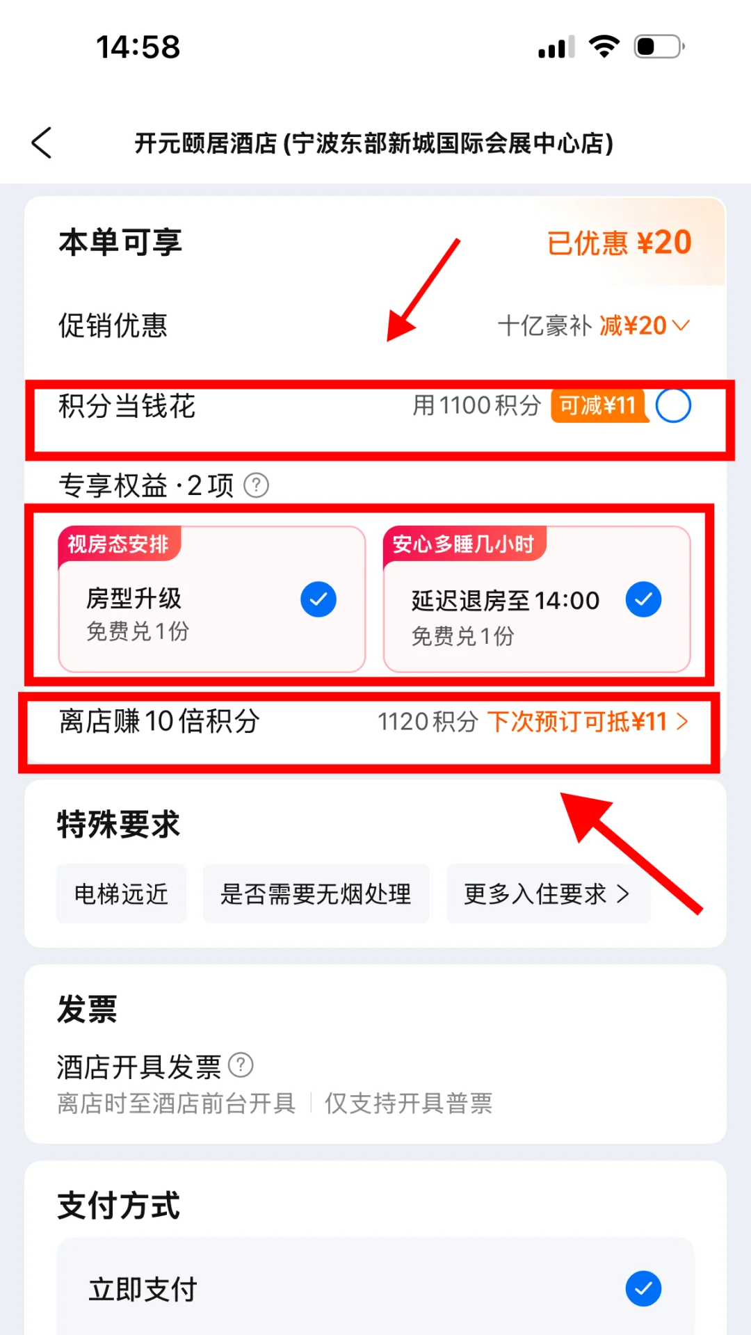 ✅另外还能享受到酒店免费早餐、延迟退房和房型升级等权益