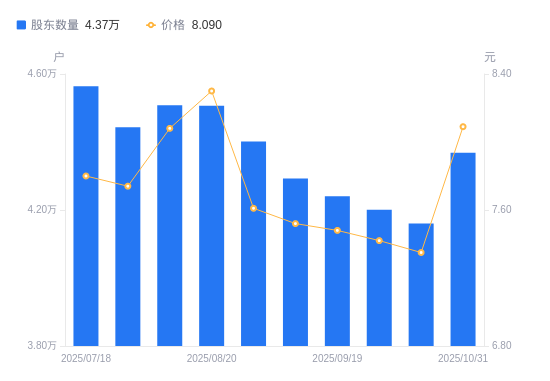 日期A股户数(户)流通A股户均持股数(股)户均持股市值(万元)2025-10-314368112590.7410.192025-10-204160613218.689.722025-09-304200913091.879.712025-09-194240212970.889.702025-09-104292712812.259.632025-08-294401412495.839.512025-08-204506812203.5910.132025-08-084508112200.079.862025-07-314443512377.439.582025-07-184563812051.179.40