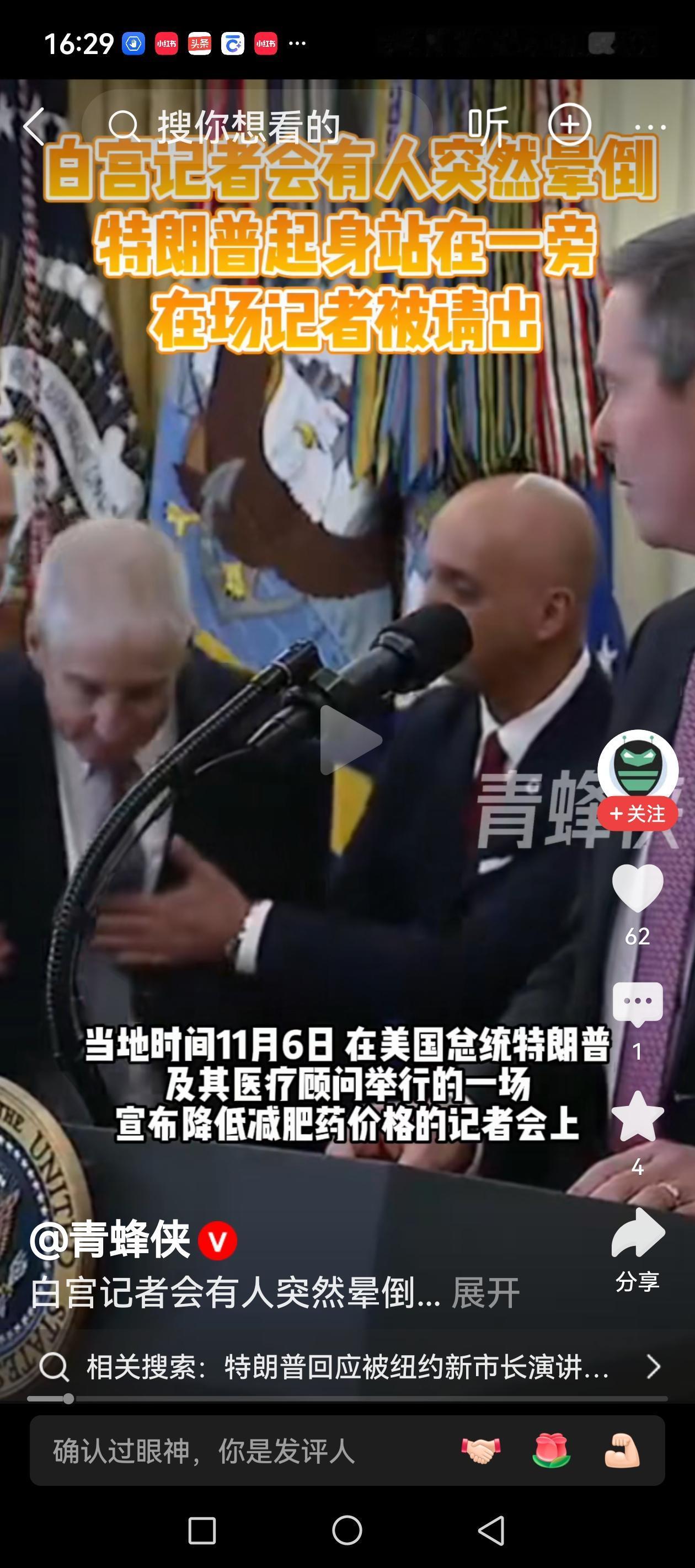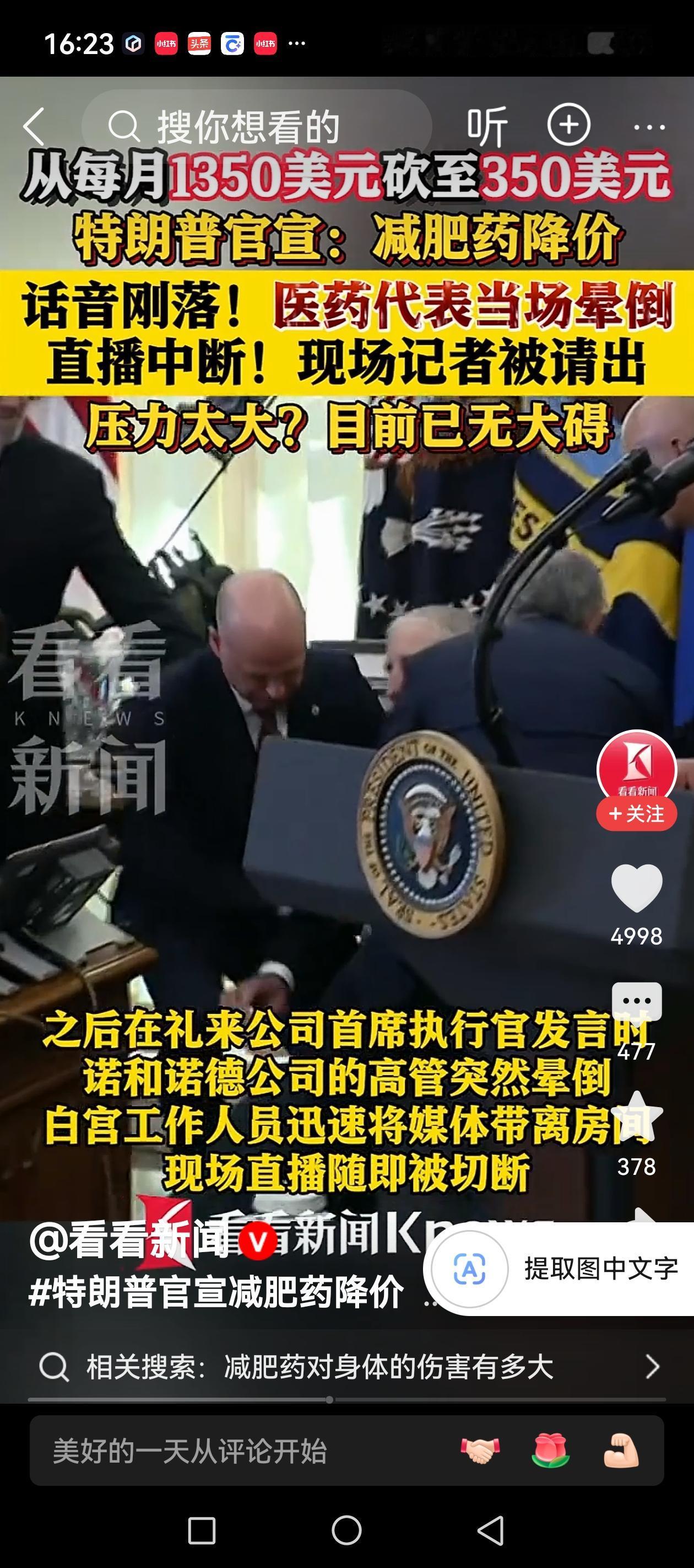 这一刻,让特朗普也懵圈了! 11月6日白宫的发布会现场,特朗普官宣减肥药降价,从每月1350美元砍至350美元。谁知话音刚落,在场的一位药企的高管当场晕倒。工作人员赶紧叫停记者会,特朗普站起身愣在了那里,这一刻恐怕真是有点懵了。不过,发布会重启后,特朗普解释道,他只是有点“头晕目眩”,正在接受照护情况良好。这位药企高管恐怕是感觉这波降价幅度太大,承受的压力太大了!