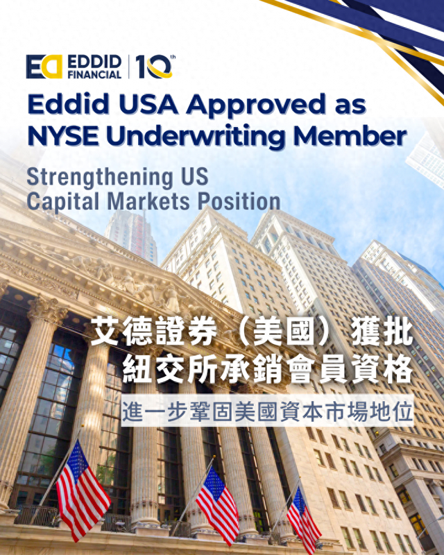 艾德金融(「集团」)旗下艾德证券(美国)继早前获纳斯达克交易所(Nasdaq)批出承销会员资格后,再下一城,获批纽约证券交易所(NYSE)及纽交所美国板(NYSEAmerican)之有限承销会员资格。集团将为有意在美国上市的企业提供从前期规划、申请准备到成功上市的全程专业服务,标志着艾德金融在美国资本市场的业务版图进一步扩展。