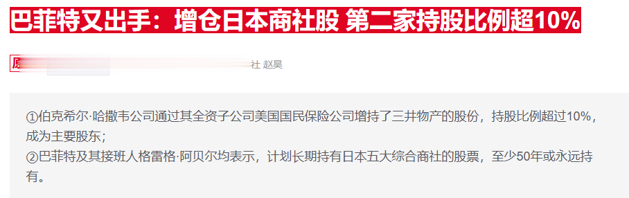 虽然伯克希尔曾同意将持股比例限制在10%以下,但随着持股接近上限,商社们已同意适度放宽限制。巴菲特也回应道:“未来伯克希尔在这五家公司的持股比例可能会小幅上升。”