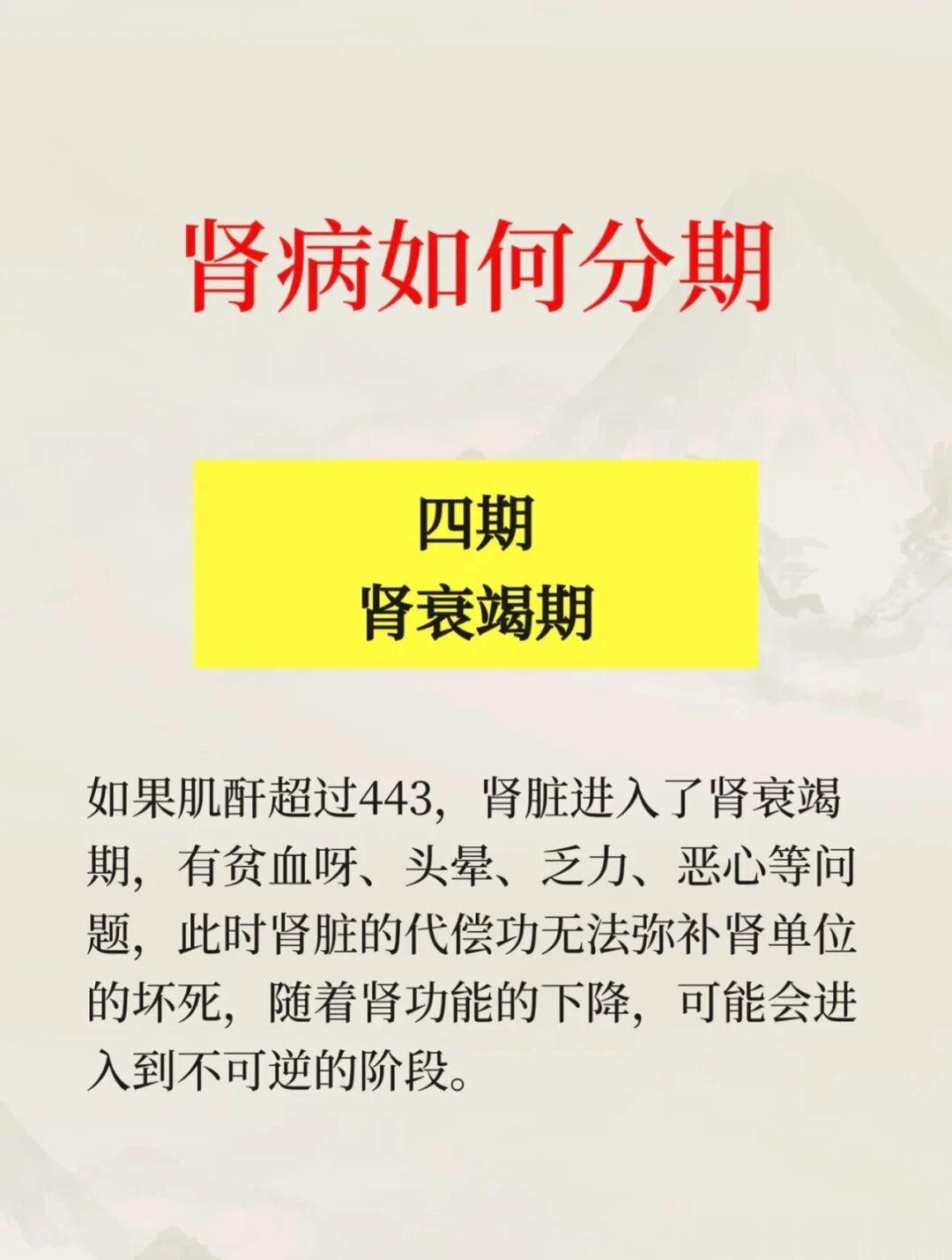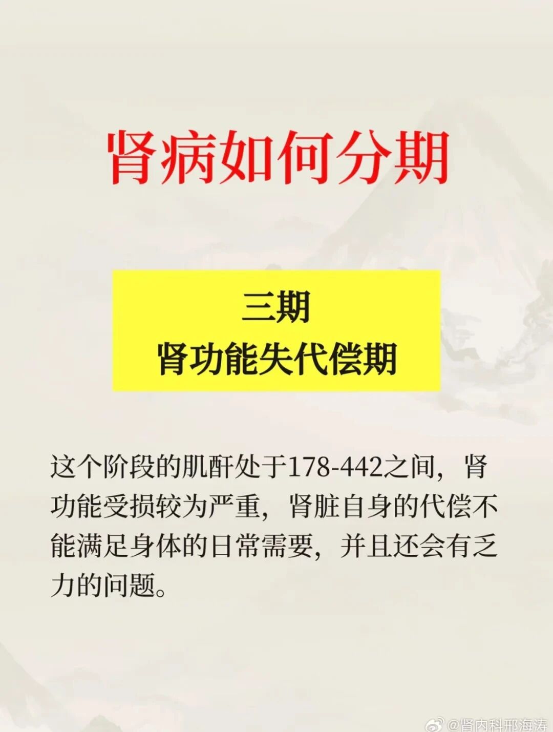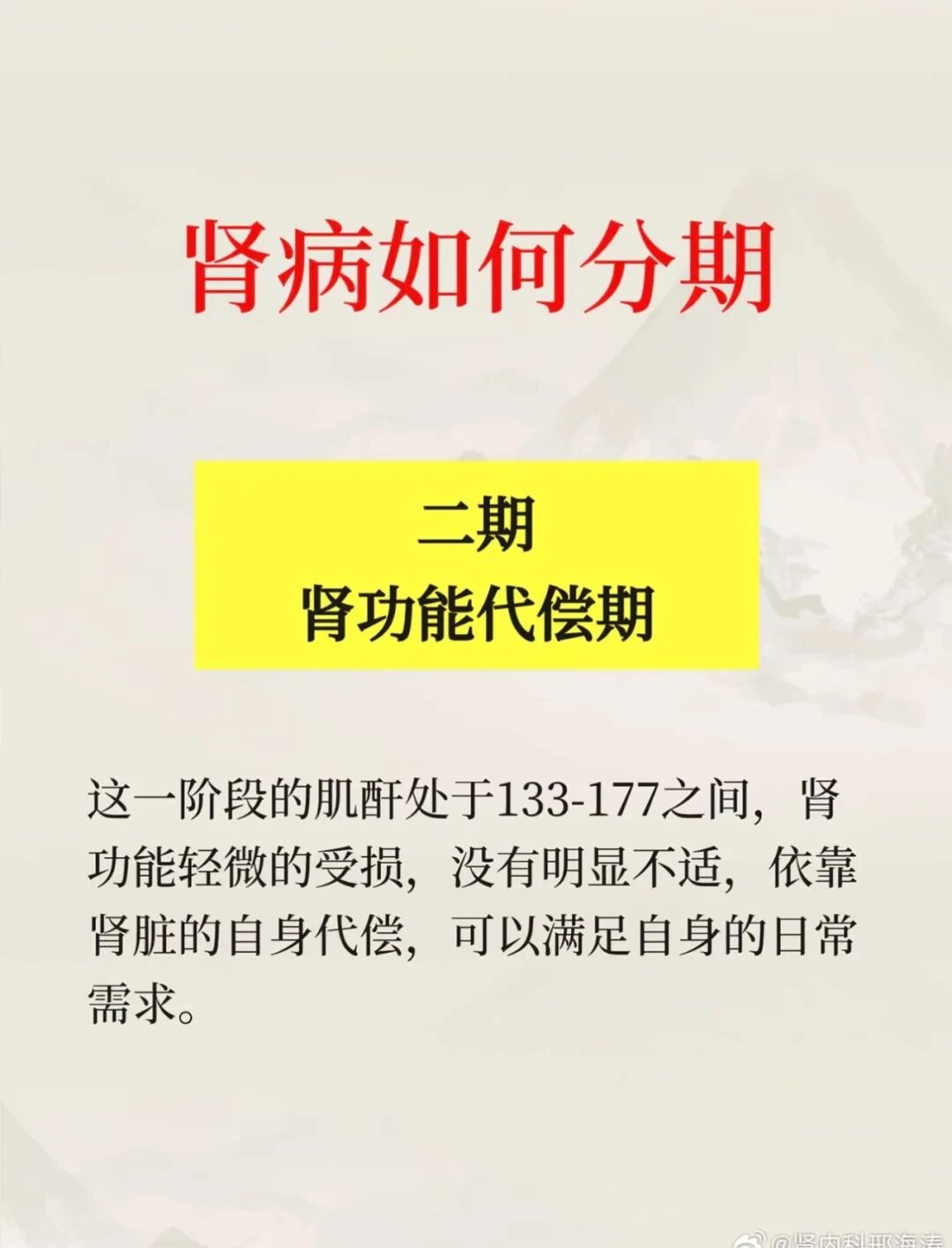 肾病1期-5期的症状有哪些?希望大家都不到5期 一期:炎症反应期👇 这一阶段肌酐正常,肾功能尚未受损,可能会有蛋白尿、浅血、水肿、高血表现,但这一阶段是比较容易治愈。 二期:肾功能代偿期👇 这一阶段的肌酐处于133-177之间,肾功能轻微的受损,没有明显不适,依靠肾脏的自身代偿,可以满足自身的日常需求。 三期:肾功能失代偿期👇 这个阶段的肌酐处于178-442之间,肾功能受损较为严重,肾脏自身的代偿不能满足身体的日常需要,并且还会有乏力的问题。 四期:肾衰竭期👇 如果肌酐超过443,肾