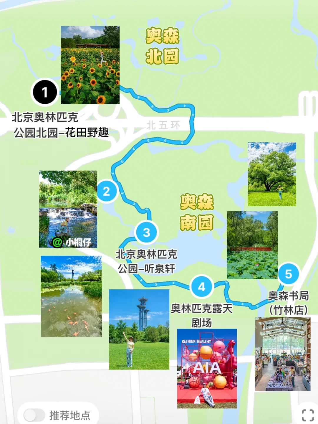 奥森北园花田野趣→奥森南园静心池→听泉轩→奥林匹克宣言广场→奥林匹克大喷泉→奥森书局