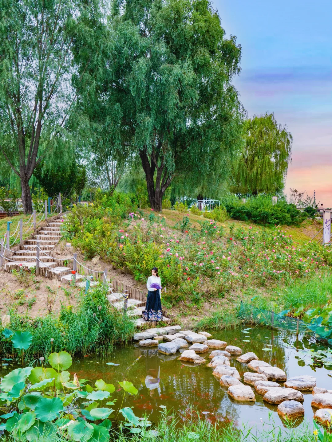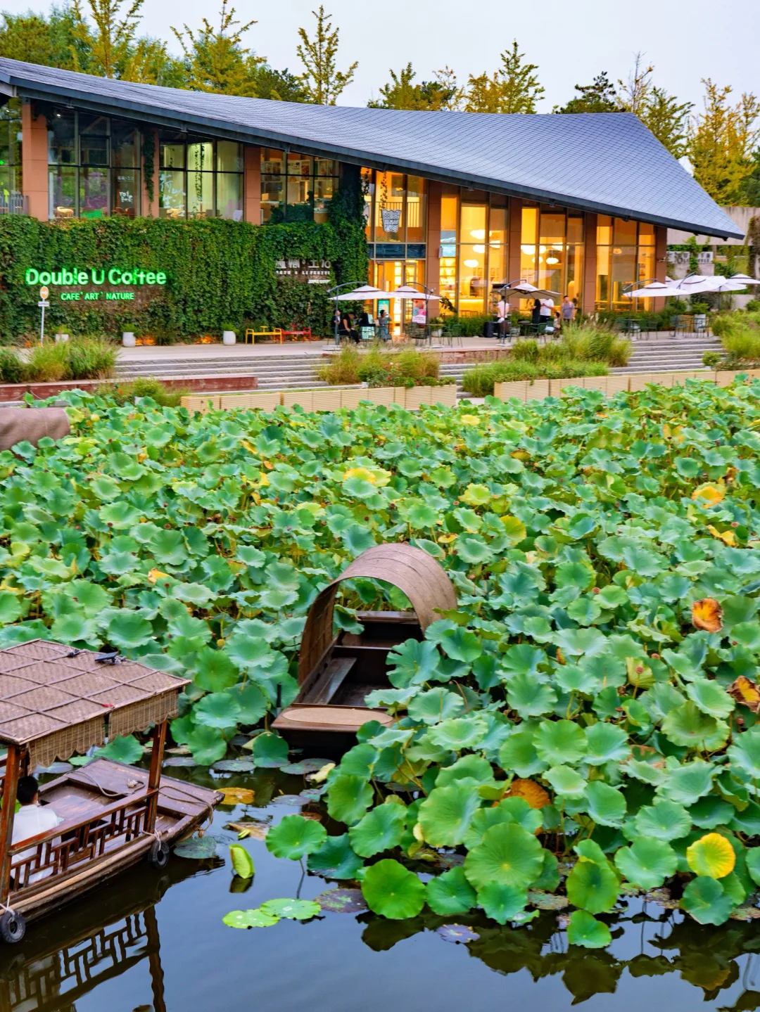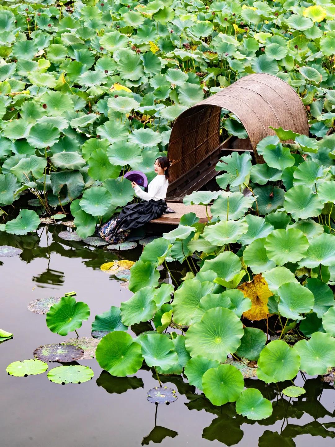 秋高气爽,比夏天来这里拍荷花舒服多了~荷花虽然没有了,成片的荷叶也很出片🪷傍晚时分来拍一组古风大片,摄影师站在桥上俯拍。乘船点有仿真荷花荷叶等道具别忘记拿哦