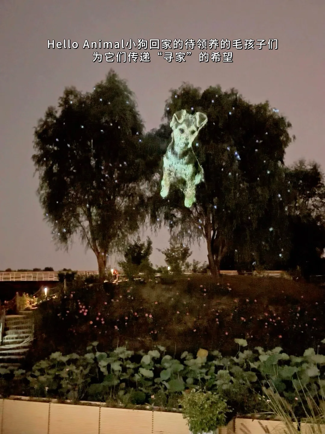 落日后,泛舟旁的咖啡厅前,心形大树上演萌宠光影秀,除了可以展示,征集来大家家中可爱的毛孩子们的图片外,园方还将与Hello Animal小狗回家合作,把待领养宠物的照片投射在大树之上,更能让更多人关注到待领养的毛孩子,为它们传递“寻家”的希望