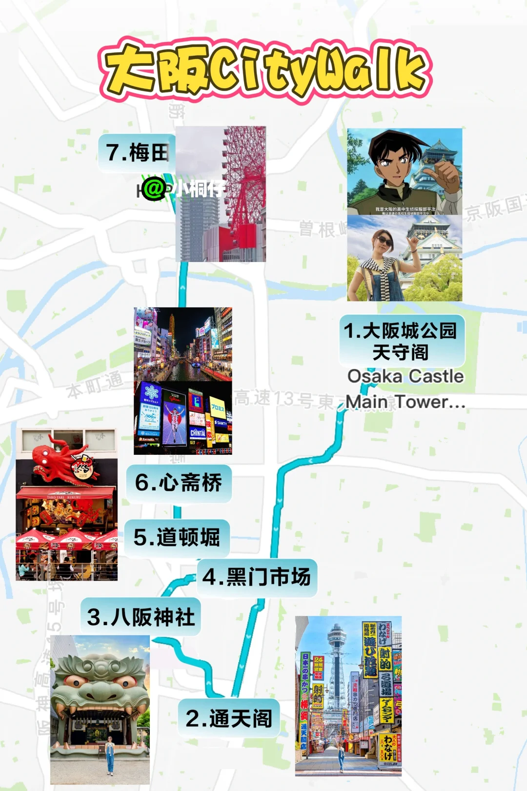 ❣️天守阁到通天阁、心斋桥到梅田需要地铁,其他步行即可