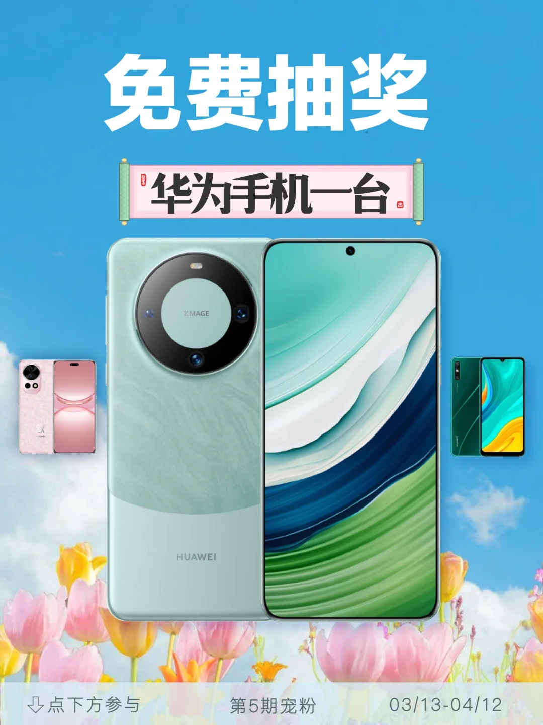 我是你们的互联网旅行搭子本月除了持续播报春天的美景🌸 又给粉丝宝宝们准备了礼品🎁 . 🎁【活动奖品】:华为手机 🎁【中奖名额】:1位(粉) 🎁【参与时间】:2025.3.13-2025.4.12 🎁【开奖时间】:2025.4.15 15:00 🎁【参与方式】:点击图片左下角的「限时抽奖」即可参与 . 中奖后7天内,需提供收货信息,逾期视为放弃 每月宠粉,不见不散👋
