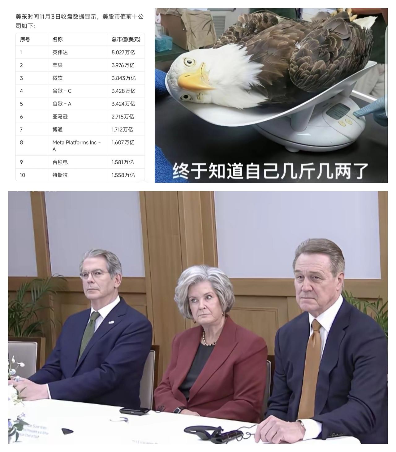 ✨美国经济建立在中国产能基础上✨ ☯ 2025年11月,美国-美股总市值为67万亿美元。而美国前10公司的总市值为29万亿美元,占总市值的43%左右。跟美国虚高的GDP总量一样高了。 ☯ 其中,英伟达一家公司的市值就超5万亿,按国家的GDP排名,是中美之外,世界第三了。在这种情况下,如果特朗普坚持同中国打贸易战,搞脱钩断链,那么美国股市总市值至少会跌一半。美国的GDP也会缩水一半。你说奇葩不奇葩。 ☯ 美西方的股市也会产生连锁反应。欧盟日韩股市崩溃,GDP立刻缩水一半。中美在瑞士进行第一轮贸易谈判时,美国就及时的投降了。否则,就不会是现在这种情形了。现在,大家明白当初特朗普为何像热锅上的蚂蚁了吧。 ☯ 特朗普心里知道。现在他完全明白了,美国的股市和美元的价值,是完全建立在中国的工业产能基础上的。没有中国,美国经济早就雪崩了,美国的内战早就开始了。现实不想象中的要严酷,美西方国家整体如此。 ☯ 其实,贫道个人认为,今后我们反过来可以拿捏美国了。不仅仅是稀土,很多产品、零部件和原材料,我们一断供,美国就麻爪翻白眼了。美国其实是一个被资本绑架,失去了主权独立的国家。美债突破38万亿,政府停摆突破历史记录,2025年美国仅航空事故就已经出了十几起。 作者:龙须面🧐