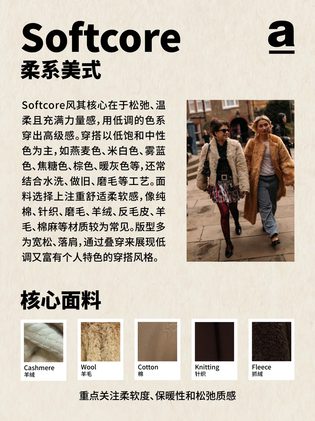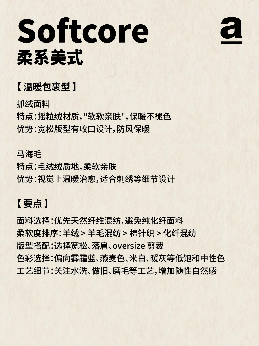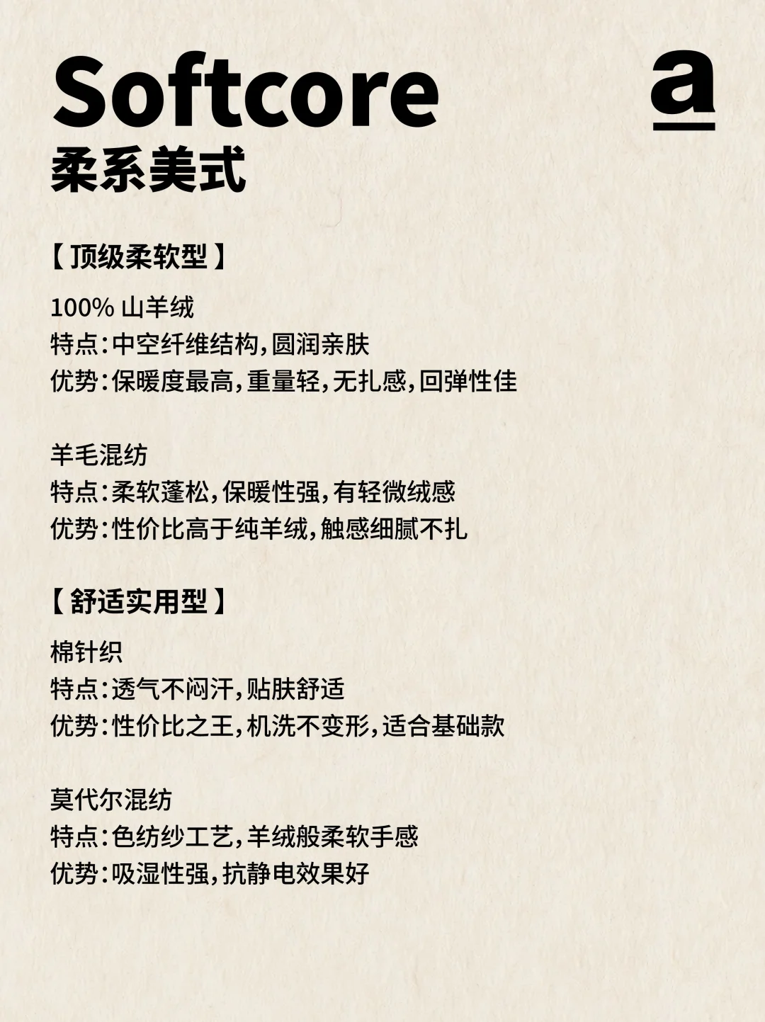 换了这几款面料才知道之前硬凹的Softcore风总像偷穿别人衣服——明明买了温柔色系,上身却又僵又显壮,直到换对面料才发现:原来软乎乎的松弛感,全靠面料“撑场面”! Softcore风的核心根本不是 “浅颜色 + 宽松款”,而是面料自带的“呼吸感”和“软质感”——摸起来要糯、看起来要轻,贴身穿像被云朵裹住,哪怕基础款也能穿出慵懒易碎的美感~ 【 面料选择 】 ✅顶级柔软型:100% 山羊绒、羊毛混纺 ✅舒适实用型:棉针织、莫代尔混纺 ✅温暖包裹型:抓绒面料、马海毛 【 要点 】 面料选择:优先天然纤维混纺,避免纯化纤面料 柔软度排序:羊绒 > 羊毛混纺 > 棉针织 > 化纤混纺 版型搭配:选择宽松、落肩、oversize 剪裁 色彩选择:偏向雾霾蓝、燕麦色、米白、暖灰等低饱和中性色 工艺细节:关注水洗、做旧、磨毛等工艺,增加随性自然感 📌最后避个雷:别选硬挺的牛仔、粗棉或亮面化纤!前者会把 softcore 风拉成 “工装风”,后者反光显廉价,哪怕颜色再浅也救不回来~ 其实 softcore 风超友好,不用费心搭复杂配饰,只要面料选对,基础款也能穿出“易碎感美女”的味道~你们最近挖到什么好穿的softcore面料单品?评论区互相种草呀!