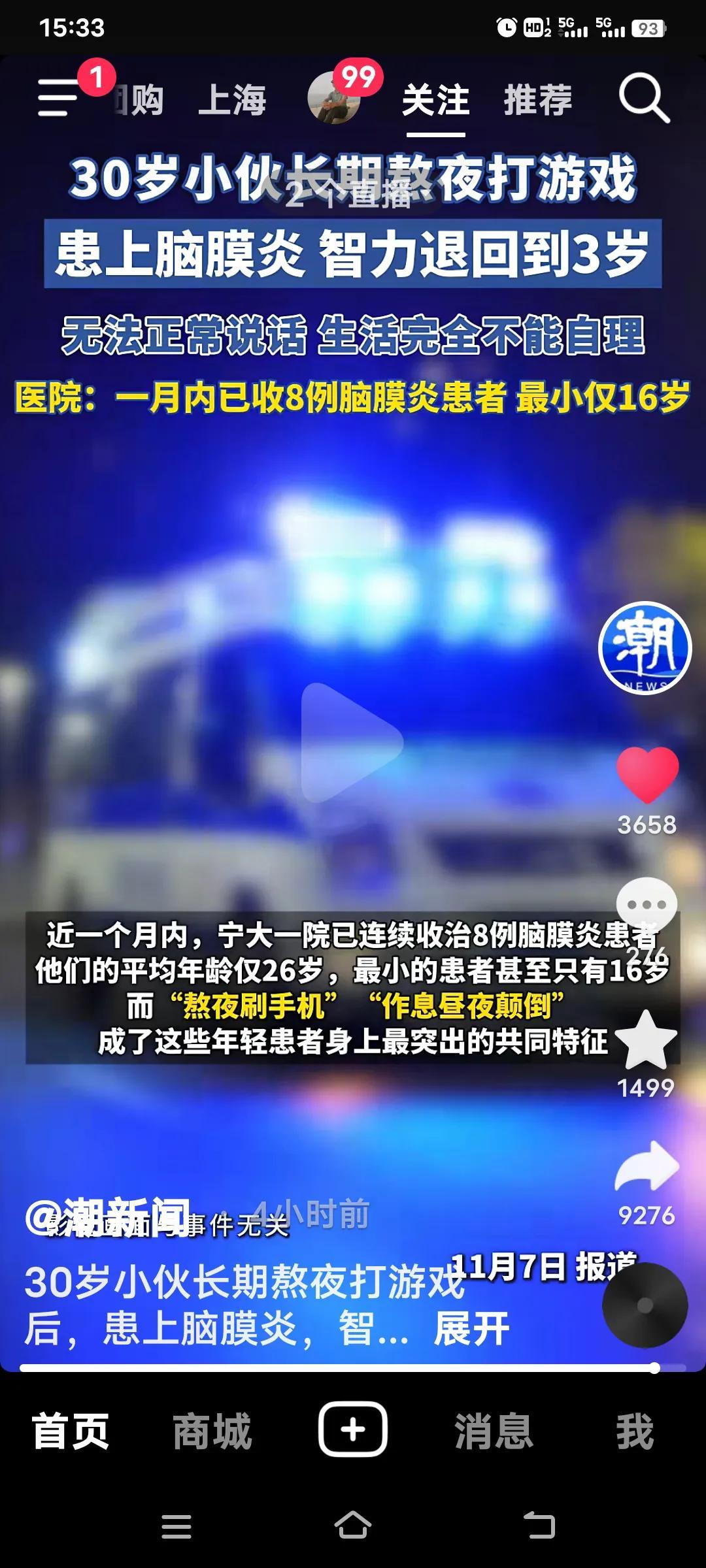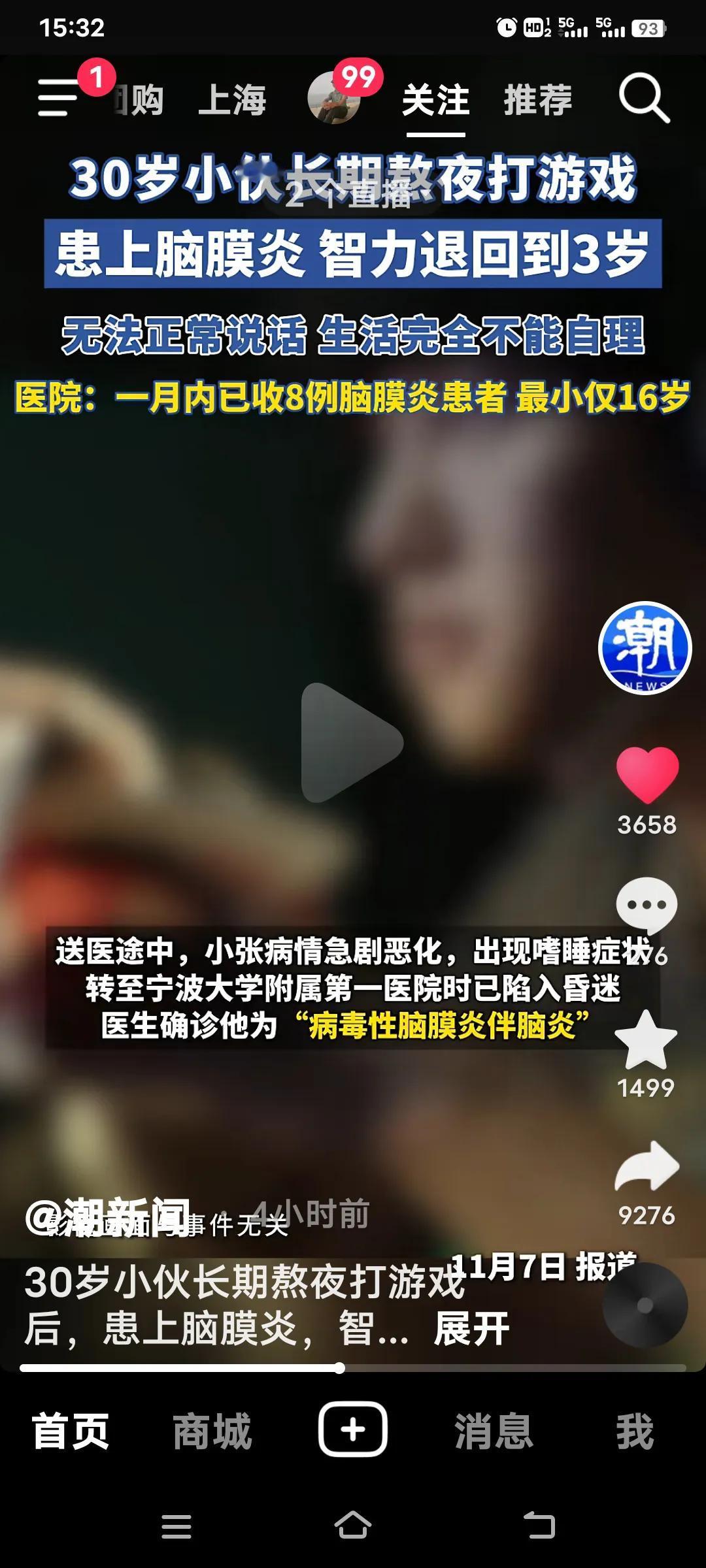 30岁小伙熬夜打游戏患上脑膜炎,智力倒退至3岁,这事着实吓人。 浙江的小张(化名)平时就爱窝在宿舍熬夜打游戏。事发当天,表姐发觉他状态异常,赶忙送医,结果被确诊为“病毒性脑膜炎伴脑炎”。虽保住了性命,但他的智力仅相当于3岁孩童,话都说不明白,生活也无法自理。 更可怖的是,近一个月,宁大一院感染科接连里救治了8例脑膜炎患者,平均年龄仅26岁,最小的才16岁。他们大多有“熬夜刷手机”“作息昼夜颠倒”的习惯。 看来得少熬夜,也别沉迷刷视频、打游戏了。像这种情况,活着还有啥盼头?智力回到了孩童时代,父母年岁渐长,以后他又能依靠谁呢?这给父母带来的只有无尽伤痛啊!熬夜损伤大脑 打麻将中风