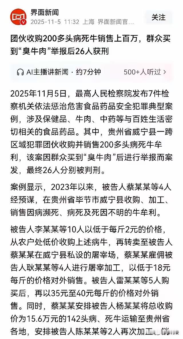 贵州毕节,男子为了牟取暴利,组织20多人到处收购病牛、死牛,每斤收购价为2元以下,随后拖回自己家的屠宰场进行宰杀加工,每斤最高18元的价格批发给雷某某等5人,雷某某等人再以35到40元一斤的价格零售出去,共计收购销售200多头牛,卖出114万余元,涉案26人均获刑。 李某某等负责收购病牛、死牛的人员,以及耿某某等负责宰杀的工人,他们明知所收购和宰杀的是不符合食品安全标准的牛,依然积极参与犯罪活动,是整个犯罪链条的重要环节,应按照其在犯罪中的作用和情节判处有期徒刑,并处罚金 到处都是病牛死牛,查到几个啊,食品安全大于天。来到市场的肉不都是要检查的吗?监管工作人员何在。 市场监督管理的工作人员都到哪里去了,为什么总是等到发生事故之后才从报警人员处获悉情况,这些人严重失职,也应该受到处罚。 现在牛肉火锅,牛肉粉,牛肉馆,会不会都是死牛烂牛,不然新鲜牛肉价格那么高。