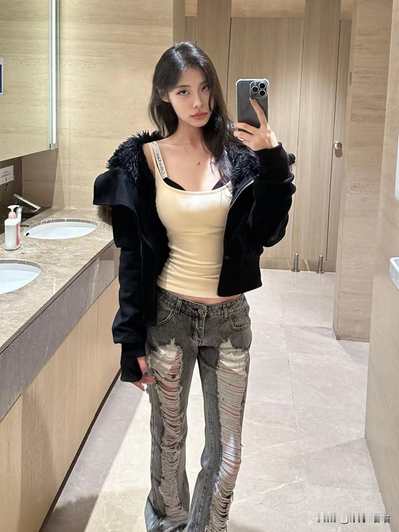 想要轻松随性的日常街头穿搭灵感?这就来分享。像藏青上衣配破洞阔腿裤,就是慵懒松