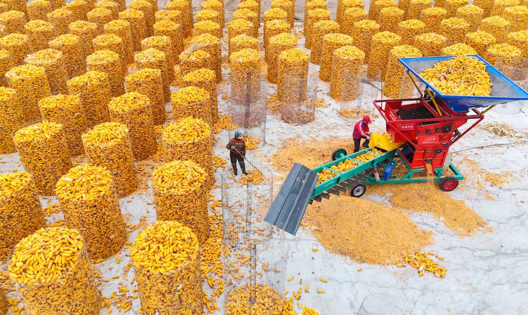 11月7日,山东省滨州市杨柳雪镇的农民在加工、晾晒玉米。