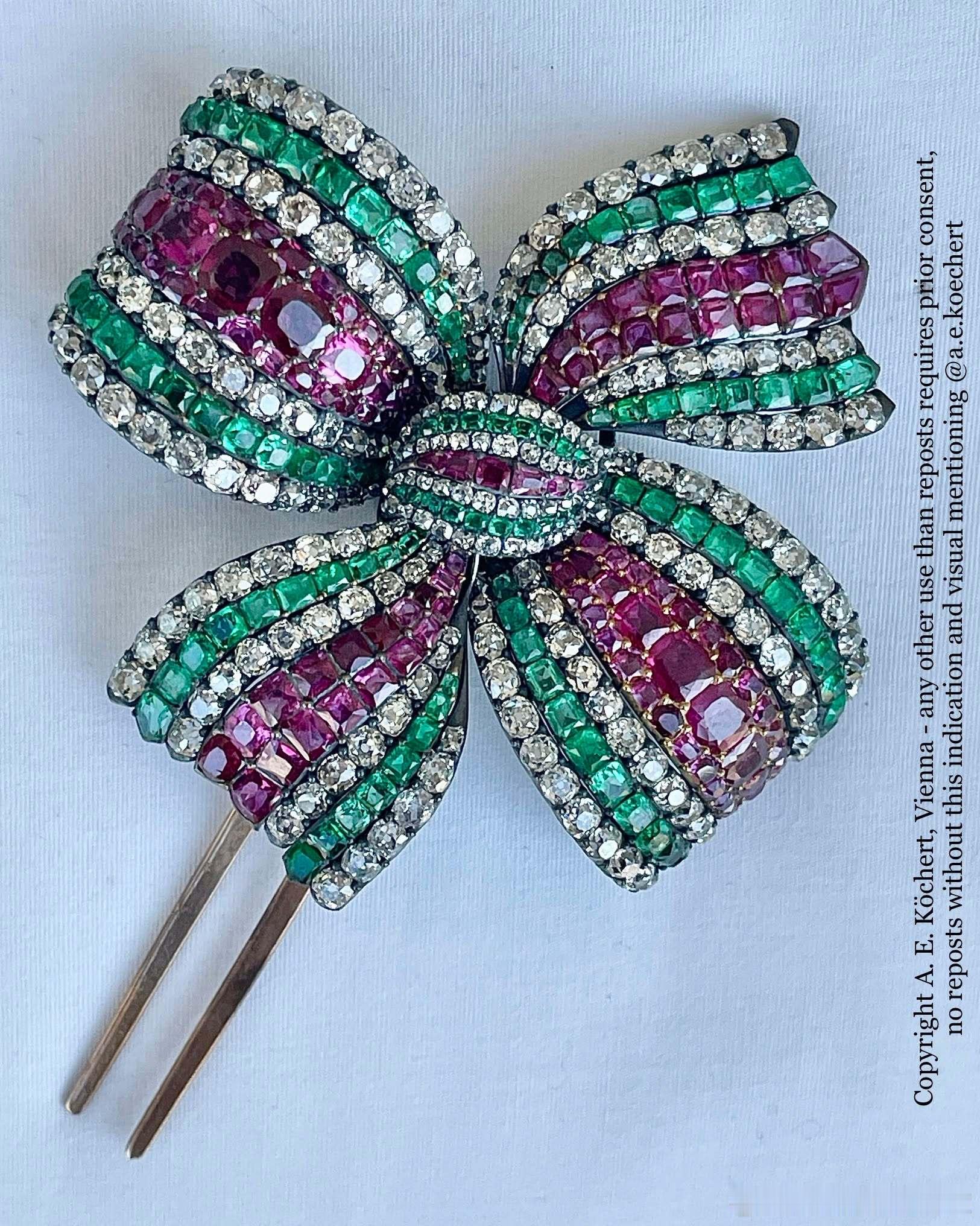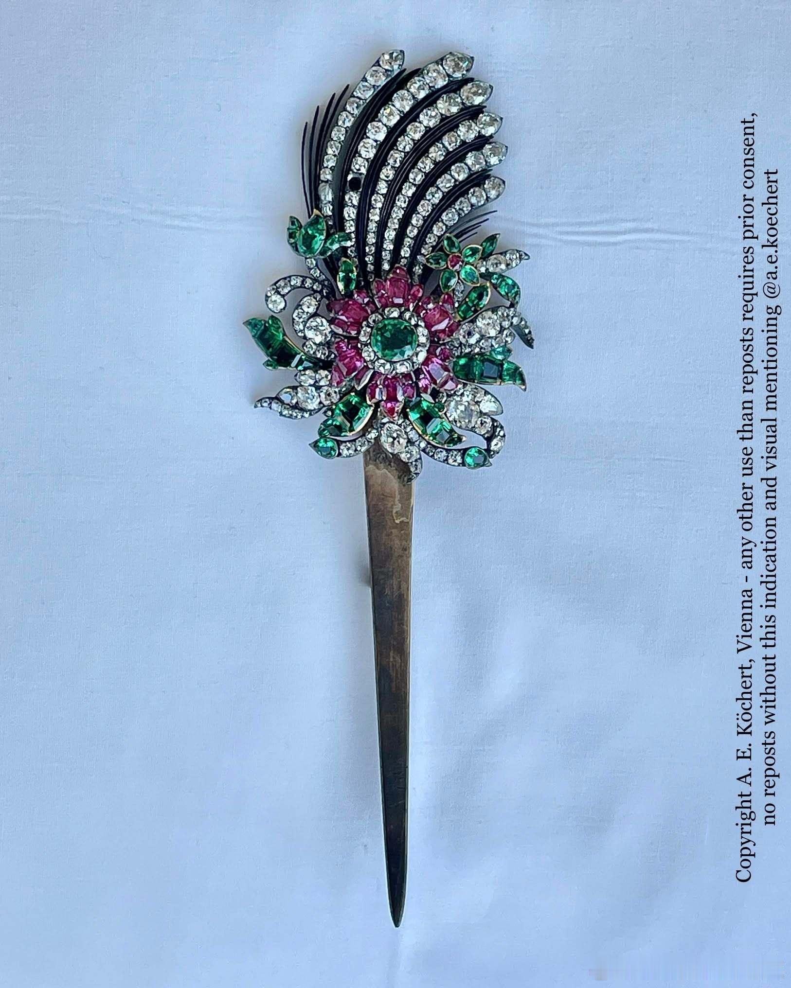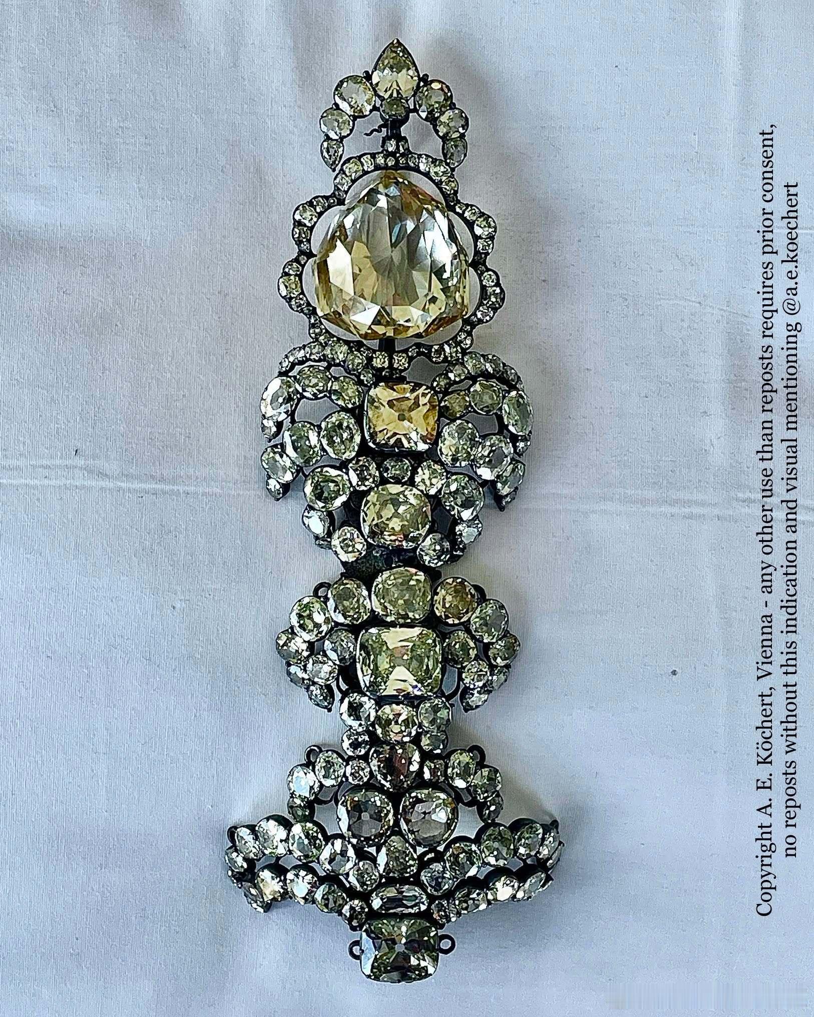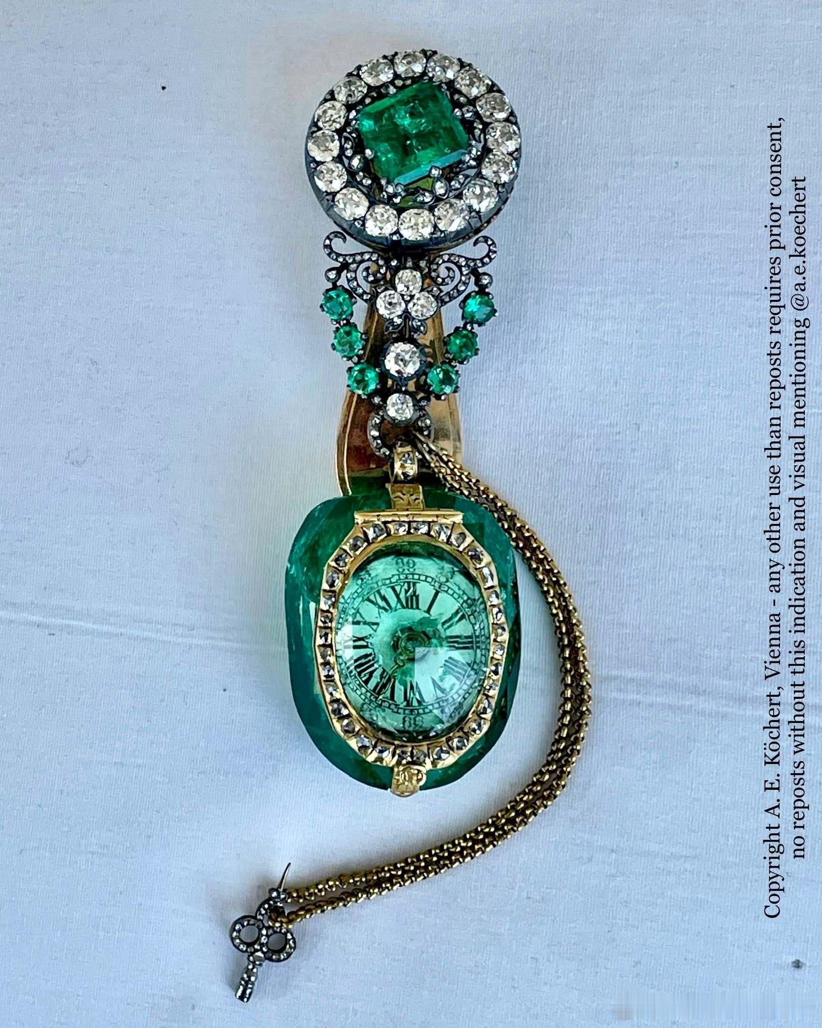珠宝 原奥地利御用珠宝商A.E. Köchert在ins上分享一些从加拿大一银行金库里新开箱的哈布斯堡家族珠宝特写,也认领了自家出品的几件珠宝,包括图2的佛罗伦萨钻石,图3的蛋面祖母绿钟表(奥地利女皇玛丽亚·特蕾莎送给幼女玛丽·安托瓦内特的礼物),图4~图6是原属于奥地利皇后伊丽莎白的珠宝,包括珍珠钻石胸针,原为皇帝弗朗茨·约瑟夫一世和皇后伊丽莎白加冕成为匈牙利国王&王后的匈牙利国旗色发饰(图5~图6)。