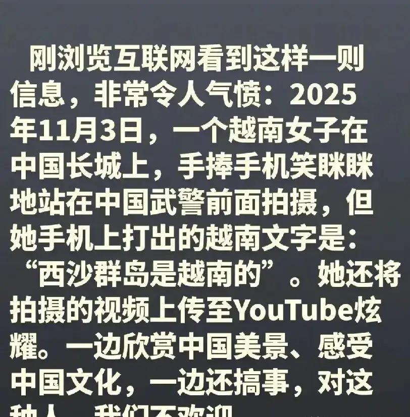 越南女鬼子:你太无知了! 最近,一个越南中年女人来中国旅游,居然在长城上当着两名中国武警的面,利用大家都看不懂越南语,明目张胆的使用手机打出“西沙群岛是越南”的标语,还录下视频发到网上去炫耀。 两名武警战士察觉异常后迅速上前,眼神坚定地制止了她的行为! 周围游客瞬间围了过来,有人看清手机屏幕上的翻译内容后,当场就怒了。“西沙群岛自古以来就是中国的,这是铁打的事实!”一位白发老人气得声音都在抖,手里的拐杖重重敲了敲地面。旁边几个年轻人立刻拿出手机查找资料,把西沙群岛的历史归属证据一条条展示给那个越南女人看,可她却扭过头,脸上还带着不屑的神情。 武警战士没有丝毫退让,一边维持现场秩序,一边用流利的英语和中文反复重申:“西沙群岛是中国领土不可分割的一部分,任何企图分裂他国领土的行为都是错误的,也违反国际法准则。”战士们的语气平静却极具力量,胸前的警徽在阳光下熠熠生辉,那是捍卫国家主权的坚定象征。现场的游客纷纷附和,谴责这种无视历史事实的挑衅行为,原本热闹的长城路段,此刻充满了维护国家领土完整的坚定呼声。 稍微有点历史常识的人都知道,西沙群岛的归属问题早有定论。中国对西沙群岛的管辖可以追溯到汉代,当时的史料就有关于西沙群岛的记载,历代政府都对其行使过有效管辖。明清时期,朝廷更是明确将西沙群岛纳入海防范围,派官员巡视、设立标识。即便到了近代,无论是《开罗宣言》还是《波茨坦公告》,都明确确认了中国对西沙群岛等岛屿的主权,这是国际社会公认的事实,不是任何个人的谎言就能篡改的。 这个越南女人选择在长城做出这样的举动,更是让人无法接受。长城是中国的文化象征,是无数先辈用血汗筑起的民族脊梁,承载着中华民族的历史与尊严。来中国旅游,本应是感受不同文化、增进彼此理解的过程,可她却借着旅游的名义,在这样具有特殊意义的地方挑衅国家主权,这种行为不仅违背了旅游的初衷,更是对一个国家和民族的不尊重。 更可笑的是,她以为用越南语就能蒙混过关,殊不知在信息发达的今天,任何企图分裂他国领土的行为,都会被当场揭穿、遭到谴责。领土主权是国家的核心利益,容不得半点侵犯和挑衅,无论是谁,无论在什么地方,只要触碰了这个底线,就一定会受到应有的反对和制止。中国一向主张和平共处五项原则,尊重各国领土完整,但这并不意味着我们会容忍任何损害自身主权的行为。 每个国家都有自己的历史和领土主权,尊重他国的主权和领土完整,是国际交往的基本准则,也是每个公民应有的素养。旅游不是挑衅的借口,无知也不能成为犯错的理由。希望这个越南女人能认清历史事实,明白领土主权不容侵犯的道理,也希望所有来中国旅游的外国游客,都能遵守中国的法律和公序良俗,尊重中国的历史与领土完整。 国家的领土主权,需要每个中国人共同捍卫。从武警战士的坚定制止,到现场游客的齐声谴责,我们看到了中华民族维护国家核心利益的决心和勇气。这种决心,源自于对历史的铭记,源自于对国家的热爱,更源自于我们对领土主权不容侵犯的坚定立场。 各位读者你们怎么看?欢迎在评论区讨论。